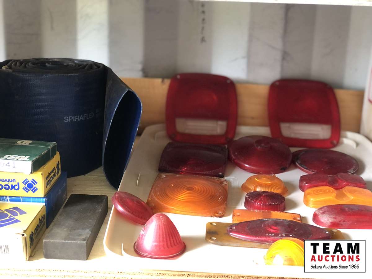 3 Headlights H4651 & H4656, (6) empty rod boxes, miscellaneous u joints and bearings, 6 inch lay flat hose, lens covers, winter front connectors, miscellaneous park lights, wheel sockets, hay wire and more