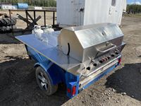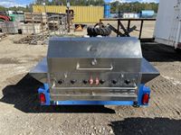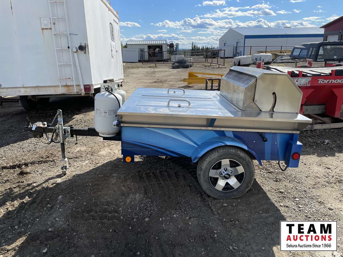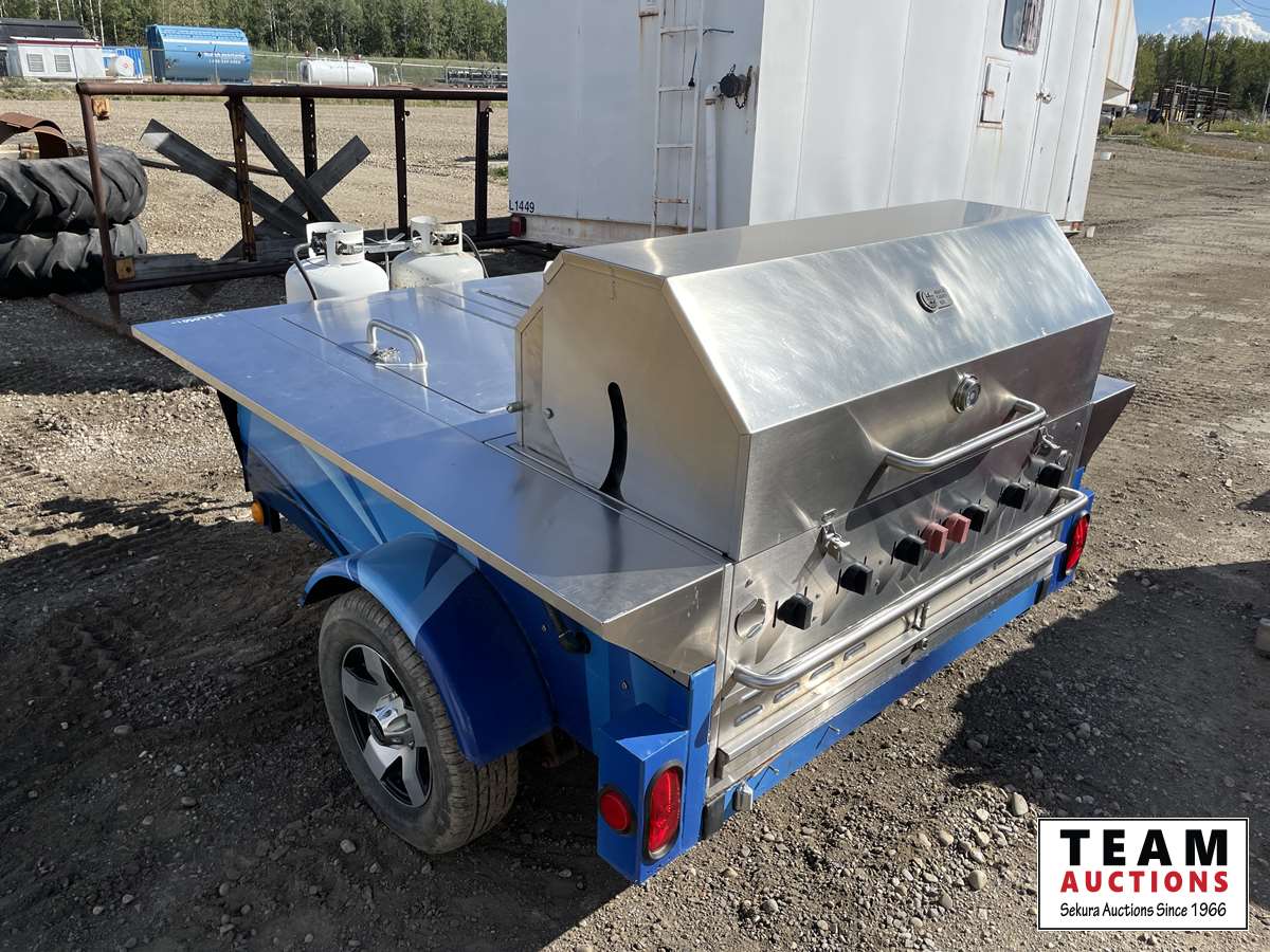Crown Verity 6 burner propane BBQ, (2) 30 lb propane bottles, (2) storage cabinets, tote of cleaning supplies & BBQ utensils, 185/70 R13 tires