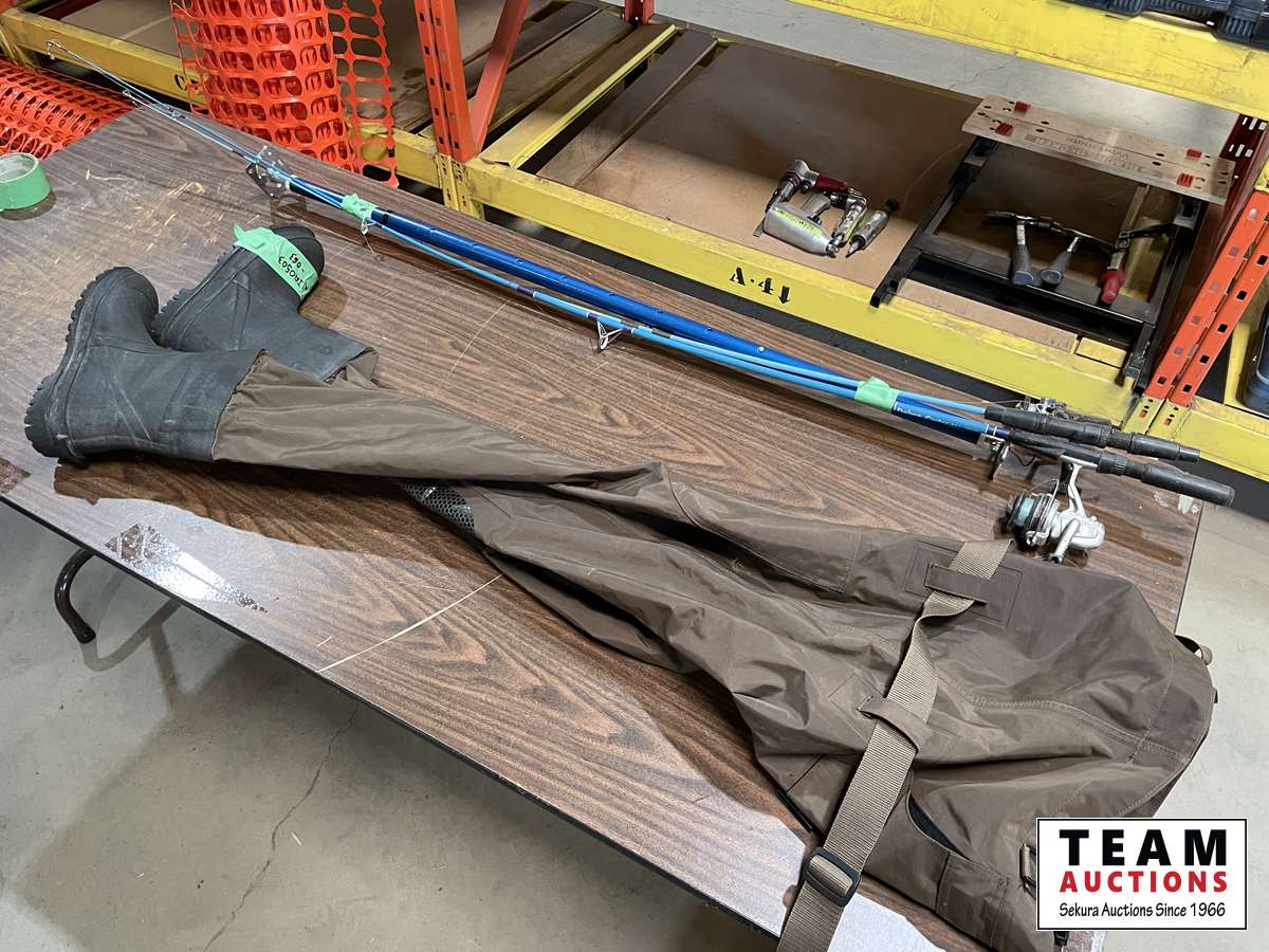 1127 Hip Waders, Fishing Rods and Adjustable Pole