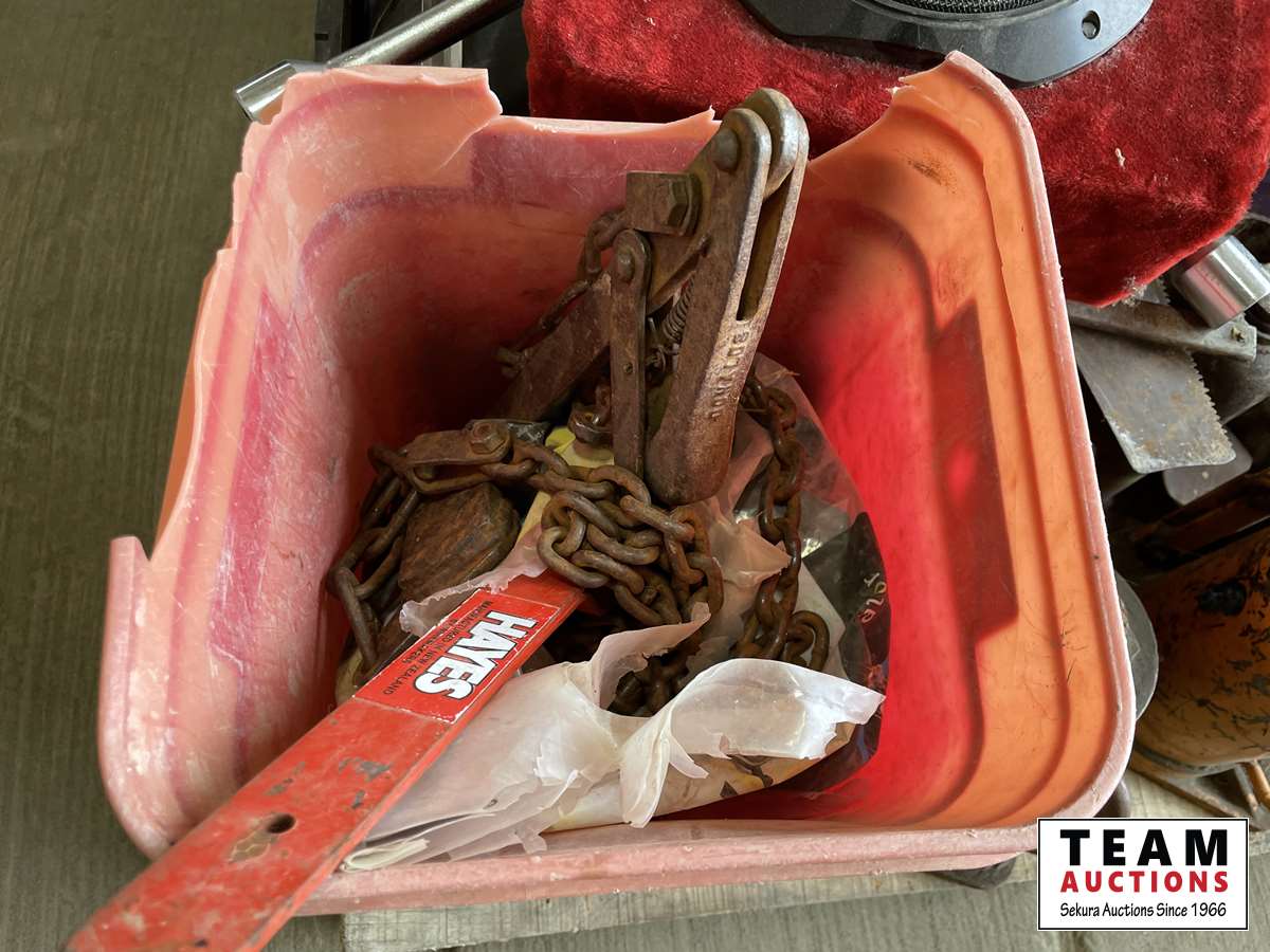 Bottle jacks, 13" tile cutter, pick axe heads, foot box of pins
