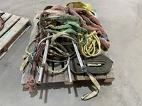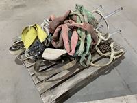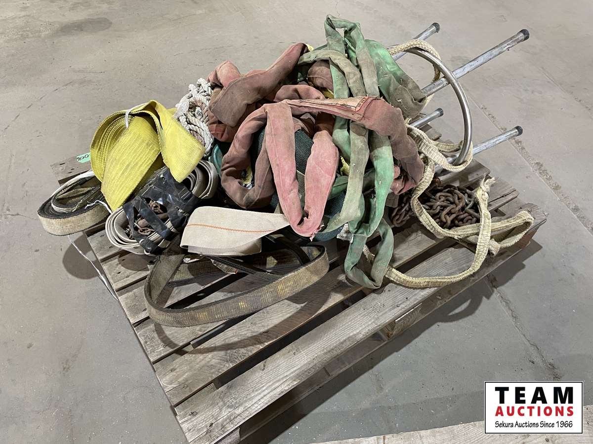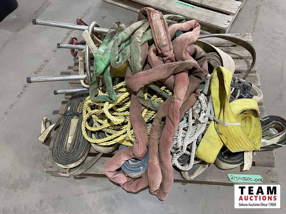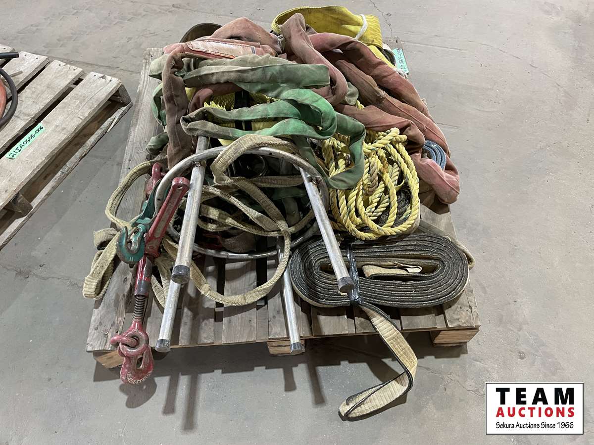 1308 Pallet of Tow Straps, Rope, Slings, Shop Stool