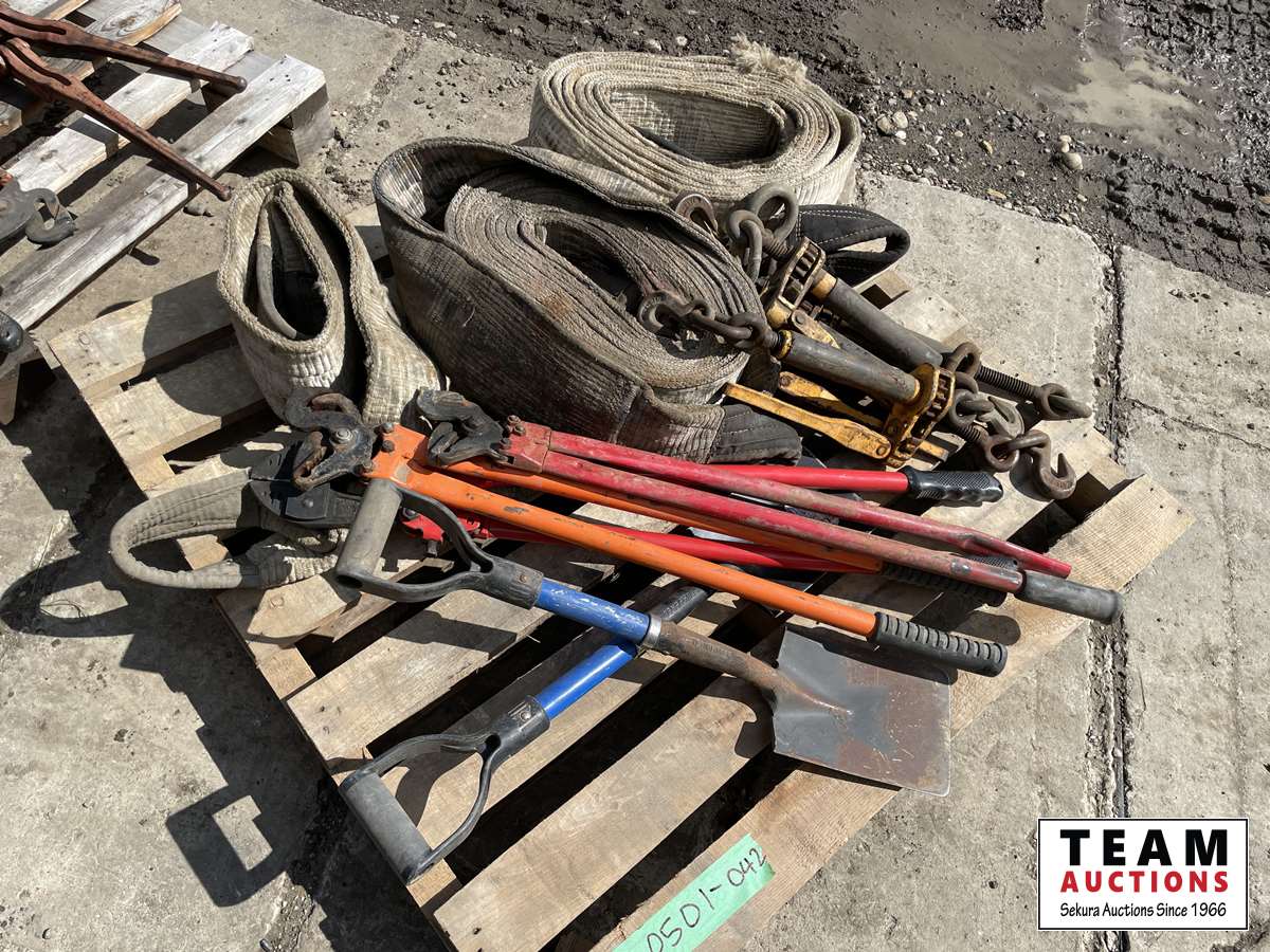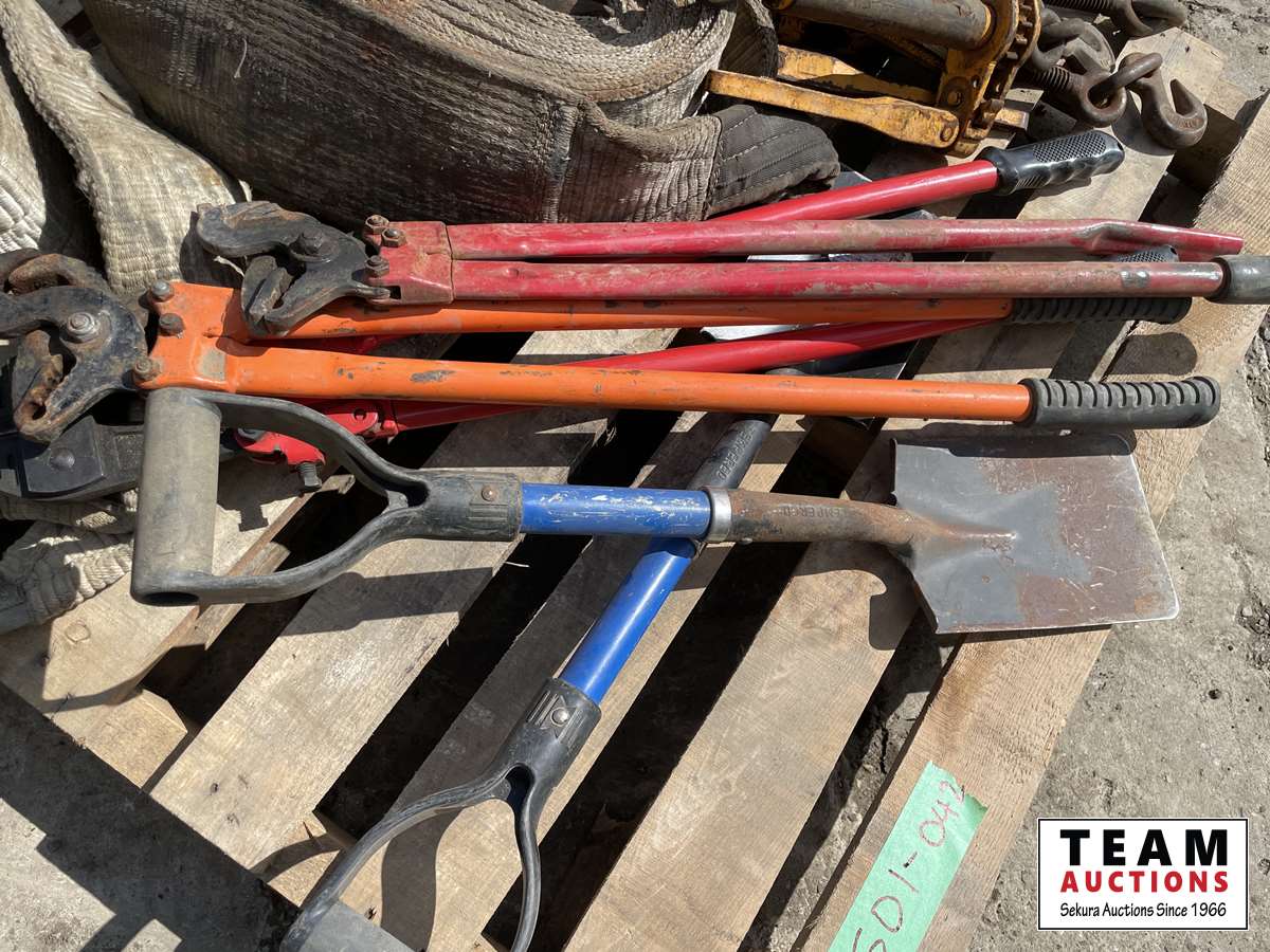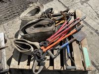 (3) slings, (2) truck chain pliers, (2) small shovels, bolt cutter, (4) load binders