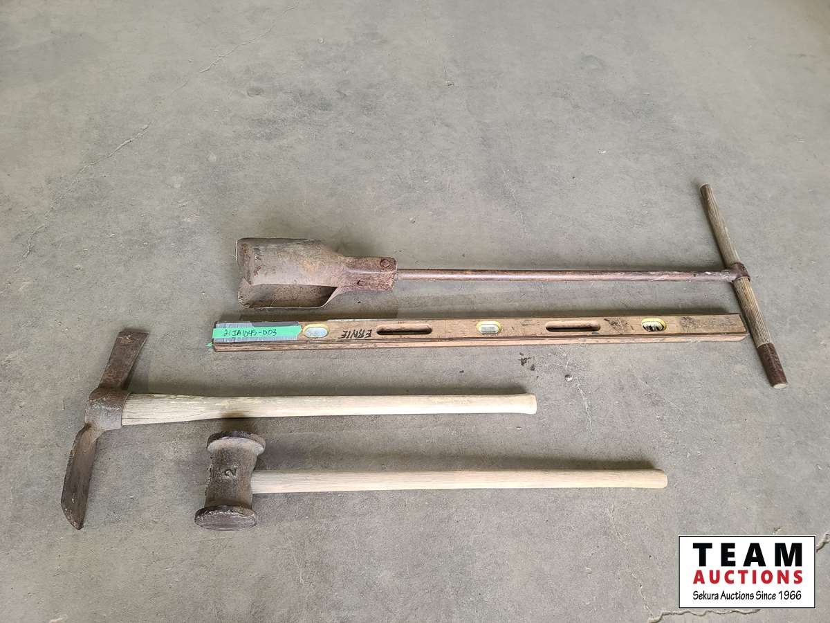 1411 Post Hole Auger, Wooden Level, Grub Hoe, Sledge Hammer