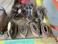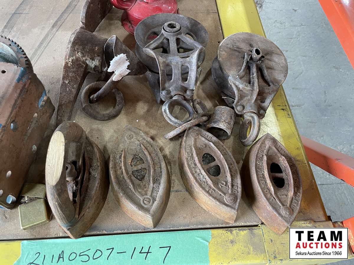 Irons, lanterns, pulleys, pick axe head, winch