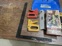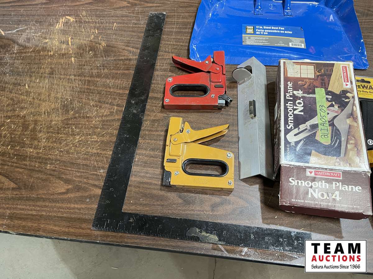 Square, hand planer, router, dust pan, level, etc.