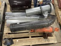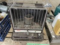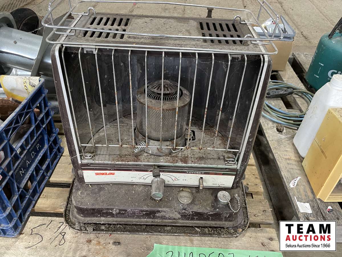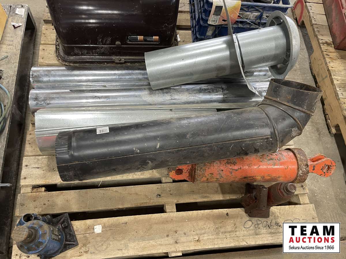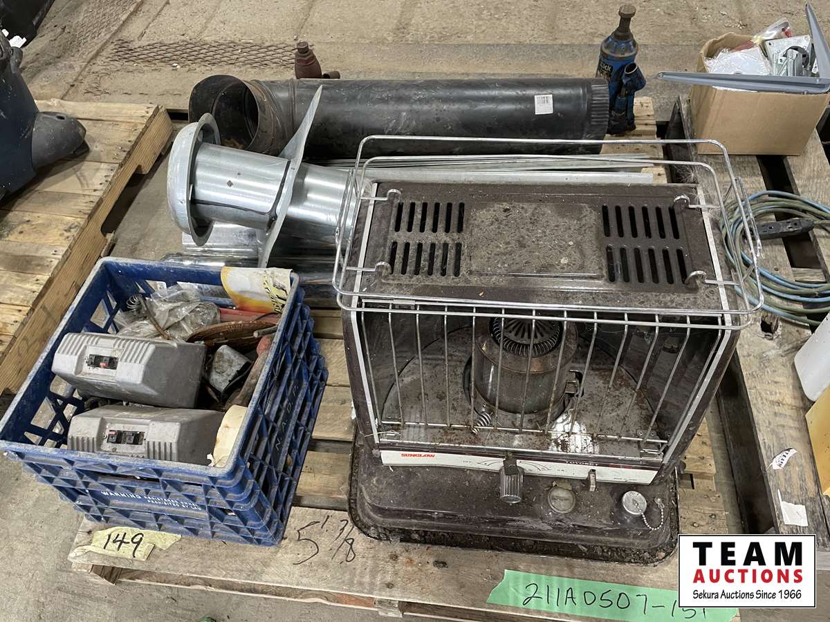 Stove pipe, kerosene heater, crate of miscellaneous, etc.