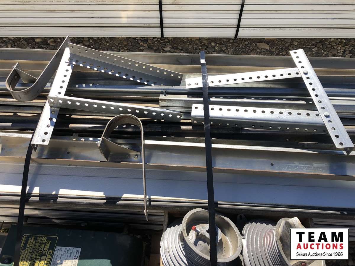 (8) panels, (3) springs, (1) motor 3/4 HP single phase 12 amp 60 hz 115V, box of hardware, rail system