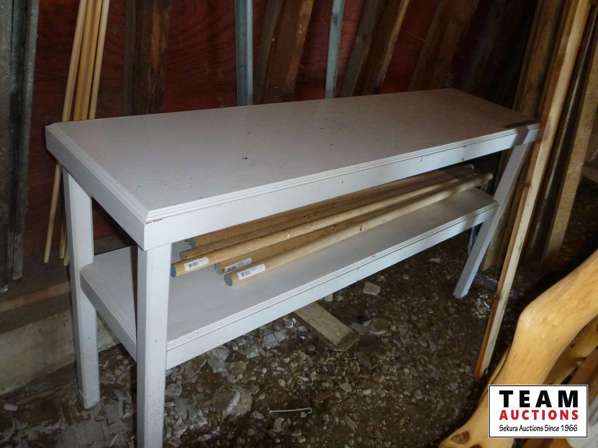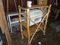 (1) 3 shelf willow unit, (1) Wood 15 inch W X 57 inch L X 29 inch H shelf unit