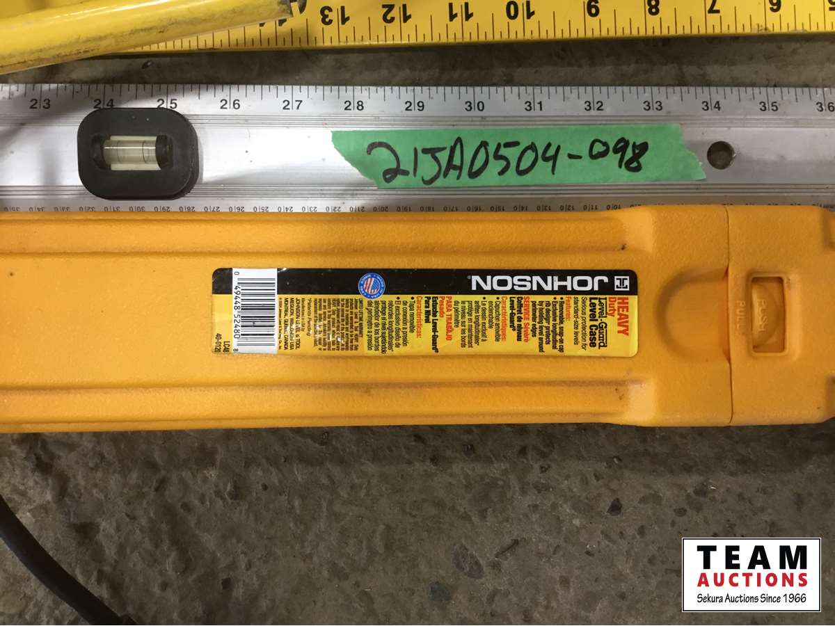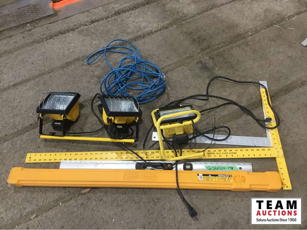 1637 (3) Work Lights, Extension Cords, Squares, Level in Case