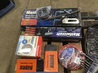 Tools, Work Bench, Air hoses, Staple gun, Wrenches, Tote with sanding discs, Socket Set, Parts