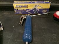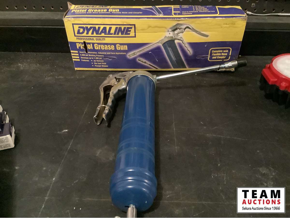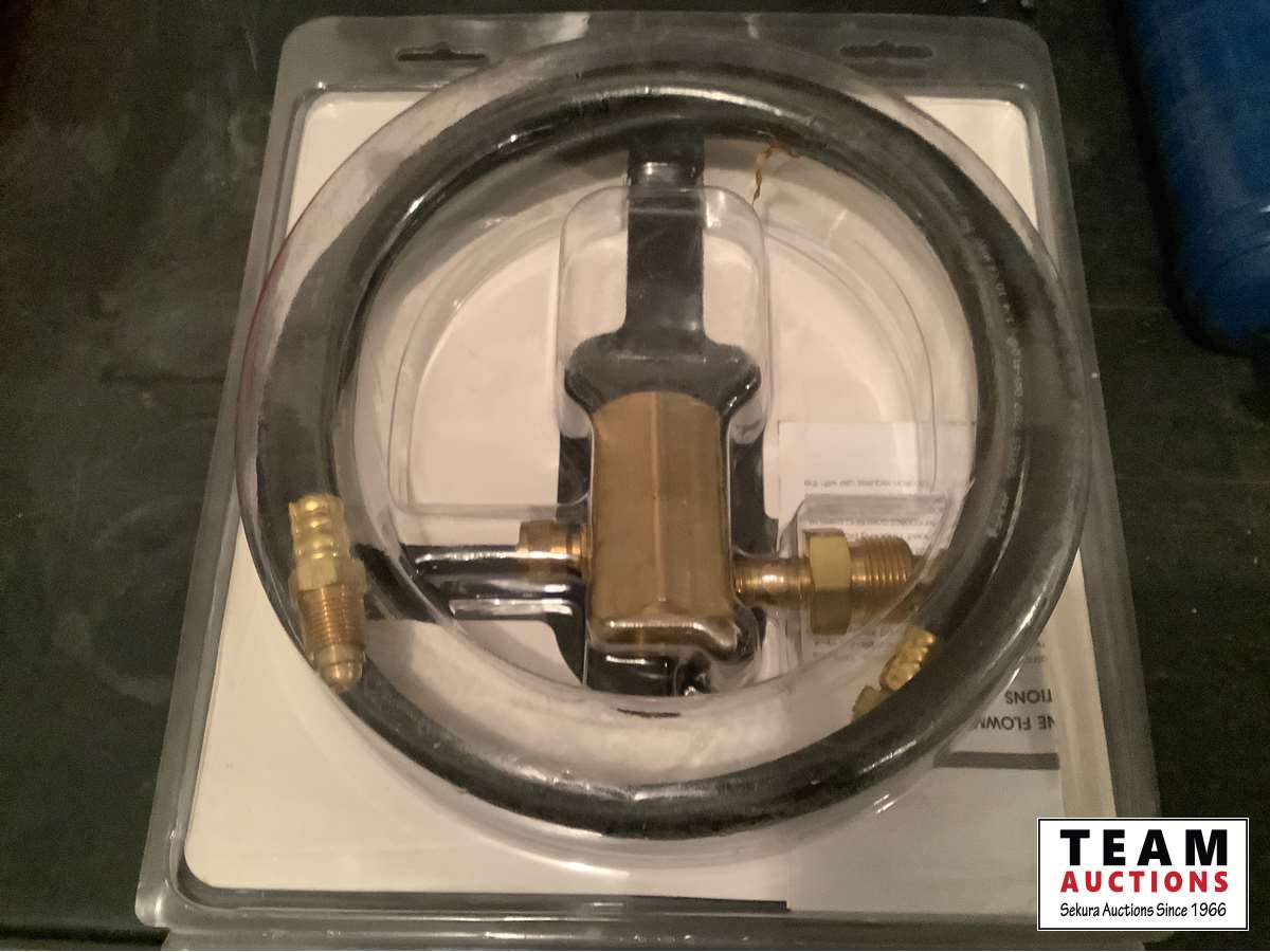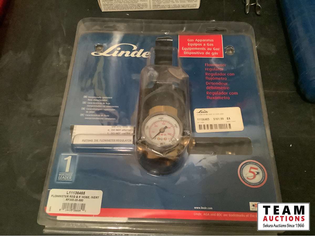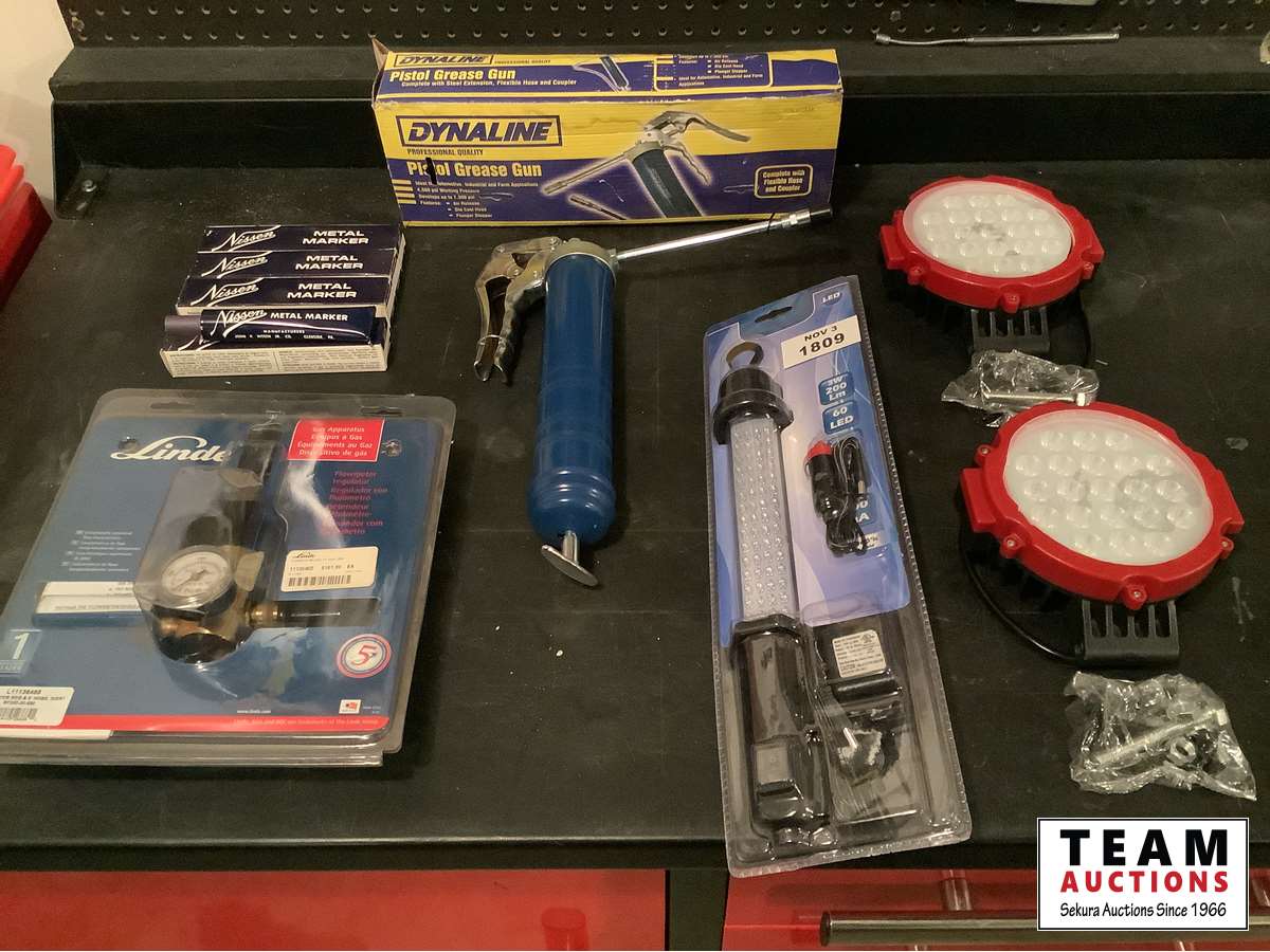 New grease gun, (4) metal markers, Linde flow meter regulator assembly with 10 ft hose, LED rechargeable work light, (2) LED 63 watt 6 inch work light