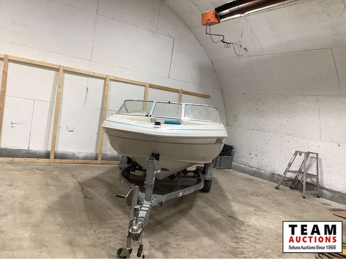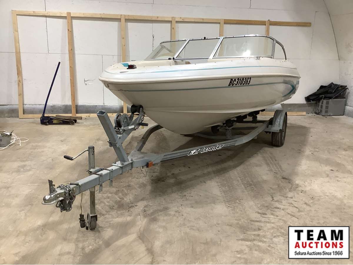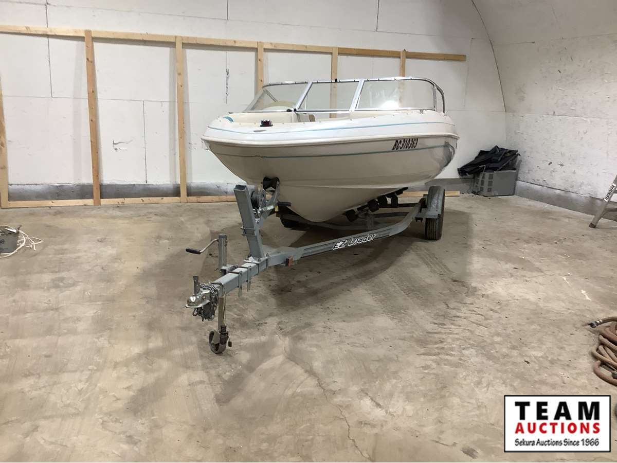 walk thru front windshield, front seating, full dash gauge package, powered by Mercruiser Alpha One inboard 3 litre engine, Mercury prop leg, snap-on tarp and canopy cover, 1996 Ezloader trailer, Alberta registered