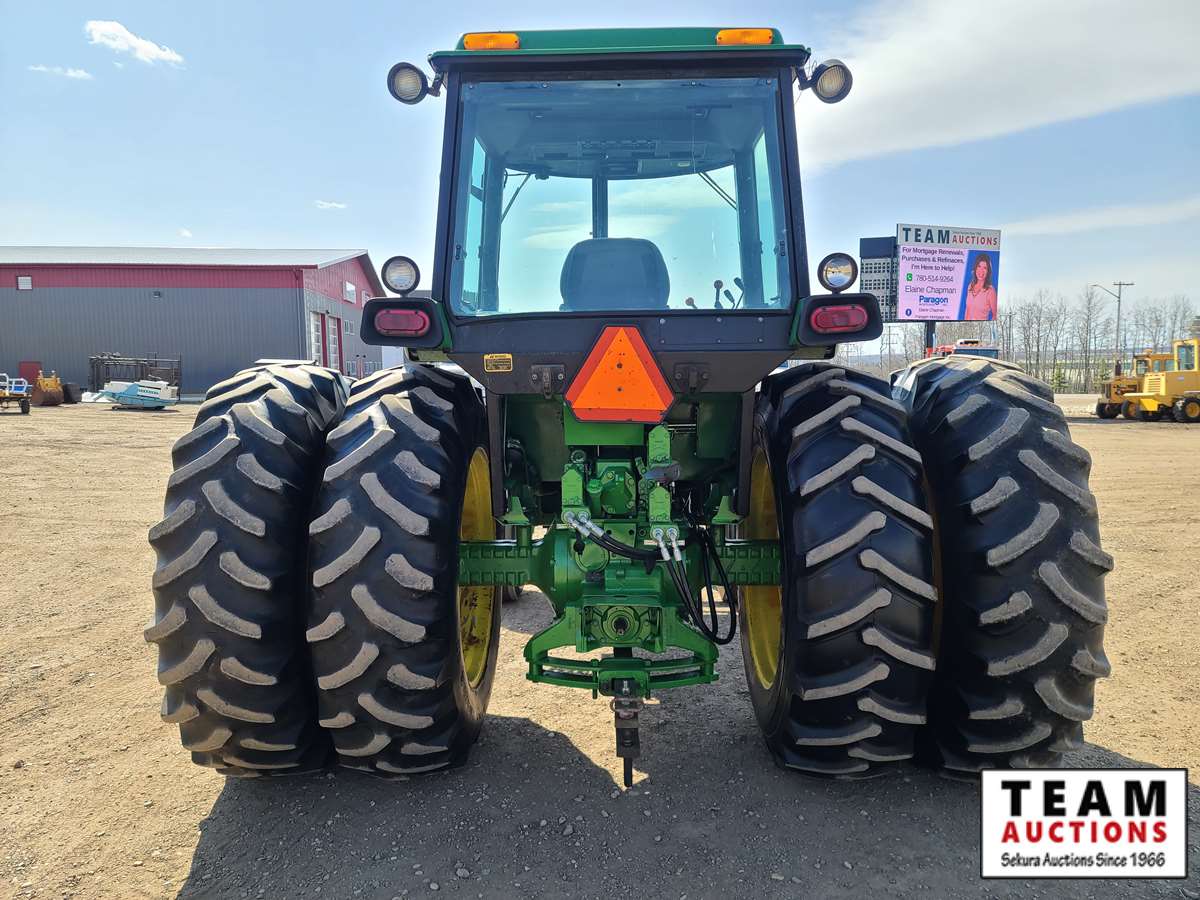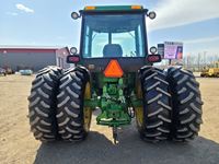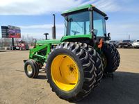 JD 148 loader, bucket, bale fork, cab, heat, A/C, 3 hydraulic outlets, 18.4-38 factory duals, 11.00-16 front tires 10,670 hrs
