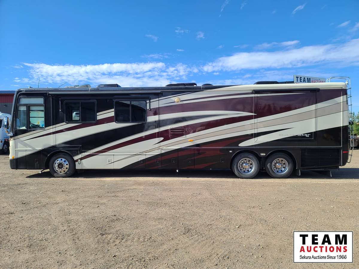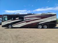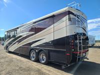 Cummins ISL 425 hp engine, Allison auto transmission, two-stage engine compression brake, 22.5" on aluminum rims, back up camera w/alarm, (4) slide outs, king bed w/new mattress, wardrobe w/sliding mirrored doors, storage, dresser, large shower w/separate washroom, washer and dryer, double door fridge, large pantry, double sink, (3) burner stove, dishwasher, dinette, leather chair and sofa, TV above cab, plus more