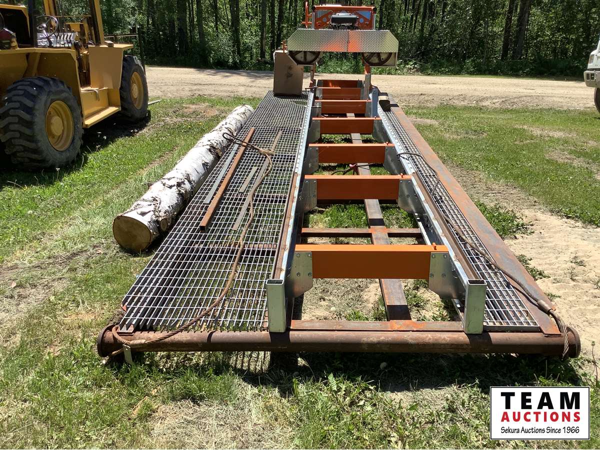 23 HP Vanguard twin cylinder engine, mounted on custom 20' rig mat skid, can cut logs 31" in diameter, 20' long, boards up to 24" wide, new box of saw blades