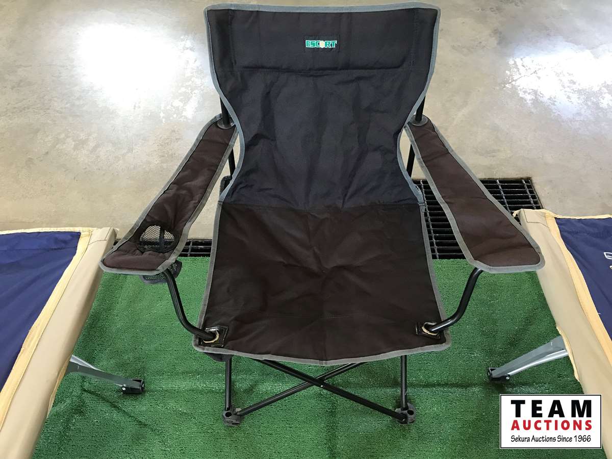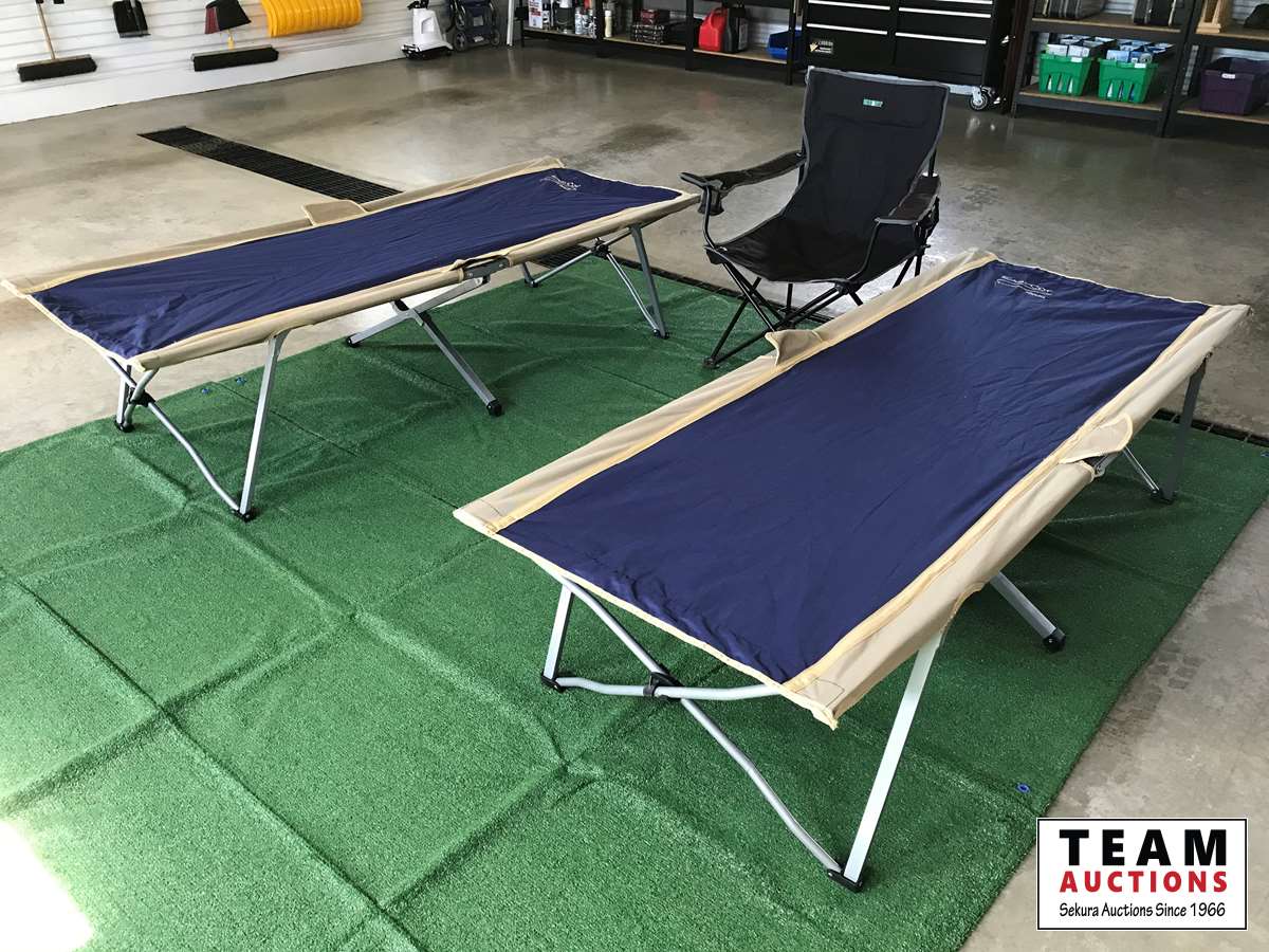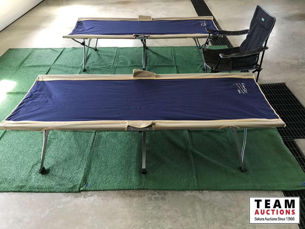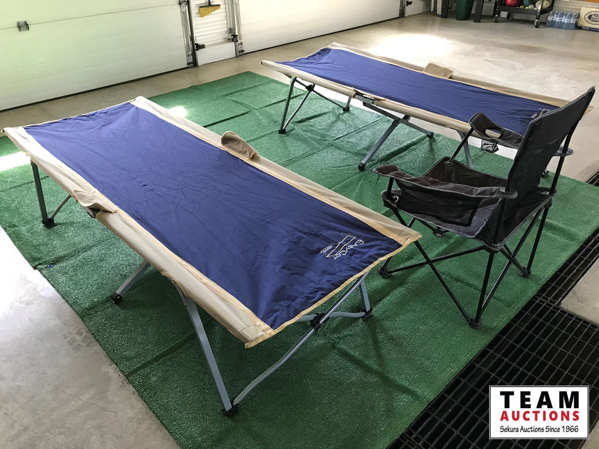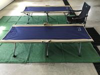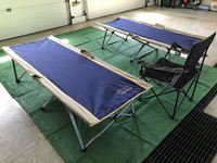 (2) Easycot folding camp cots, (1) Escort Folding lawn chair, (4) RV carpets 6' X 9', comes with storage bags