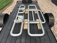 came of 2018 Kenworth short hood, attaches in front of factory bumper thru frame holes and has 2 tow hooks on front, flips down for hood opening