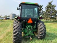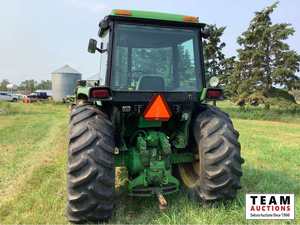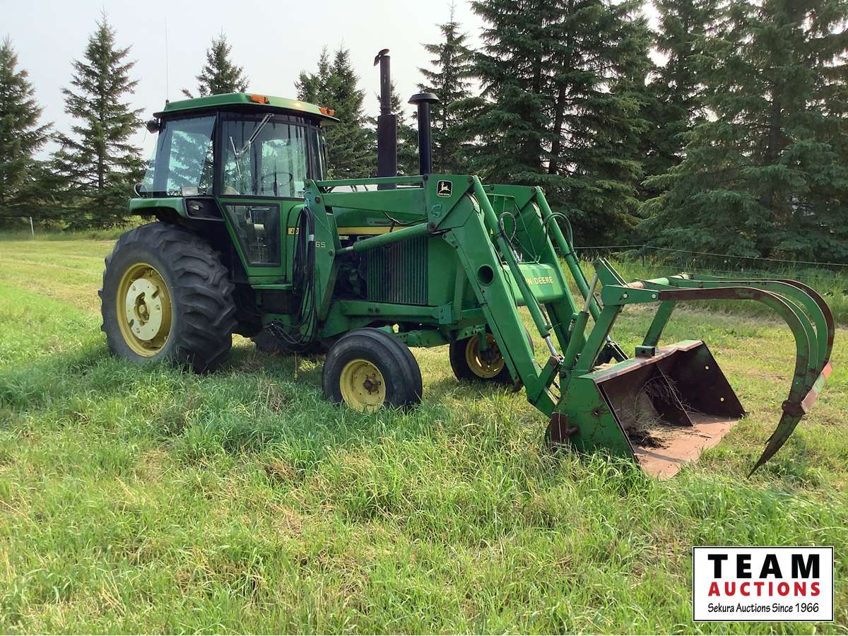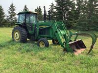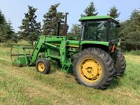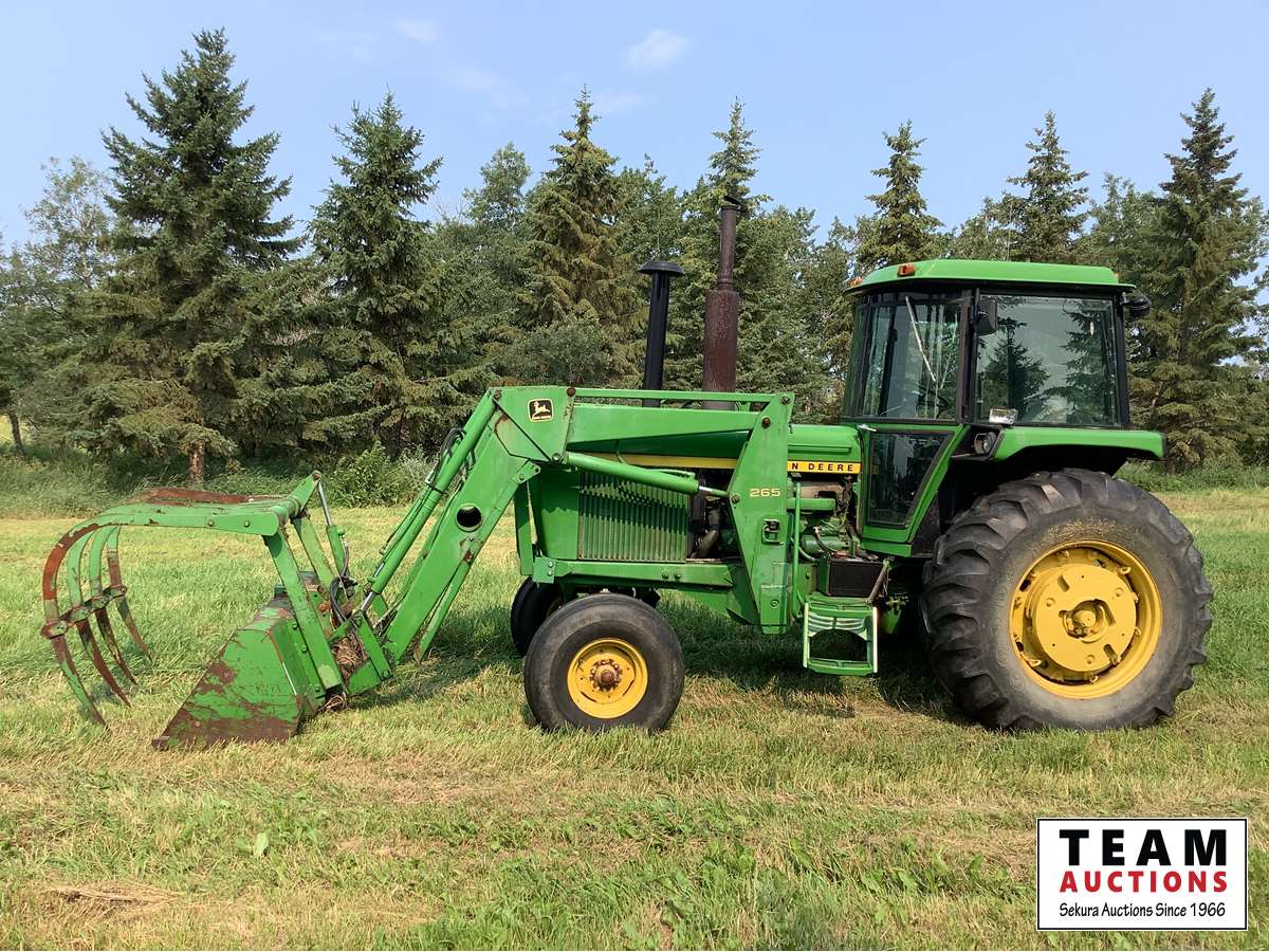 John Deere 265 loader, Q/A bucket and grapple, joystick, cab, heat AC, radio, 16 speed quad range transmission, rear dual hydraulic couplers, 540/1000 PTO, rear wheel weights, front grill guard, 10.00 x 16 front & 20.8 x 34 rear tires