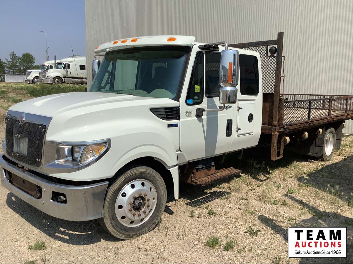 Maxxforce 7, 6 cylinder diesel, Allison automatic transmission, hydraulic brakes, AC, radio, deck has fold down sides, tool box, all aluminum rims, 225/70R19.5 tires