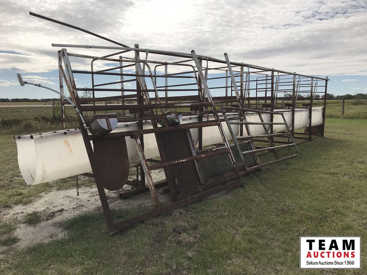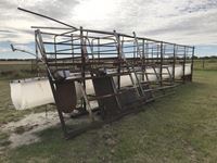 (7) 8 ft x 5 ft tie stalls, stainless steel water bowls, poly feeders