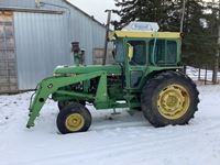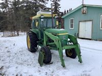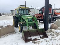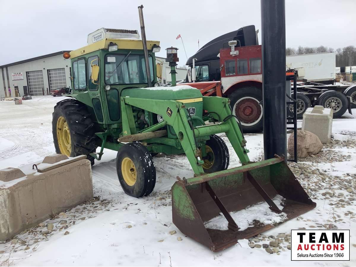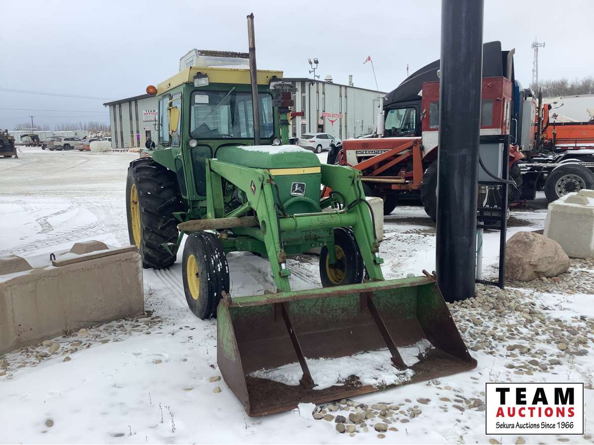John Deere 148 loader, bucket, Cozy Cab, Bycool cab cooler, engine block heater, 16 speed transmission, 3 PT hitch, 540/1000 PTO, (2) rear hydraulic outlets, 10.00 x 16 front & 18.4 x 38 rear tires