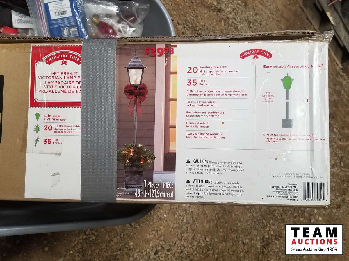 110 Extra Large Tote With (2) 4 Ft Prelit Victorian Lamp Posts, (2) Rubber Christmas Mats, Christmas Lights, & Misc