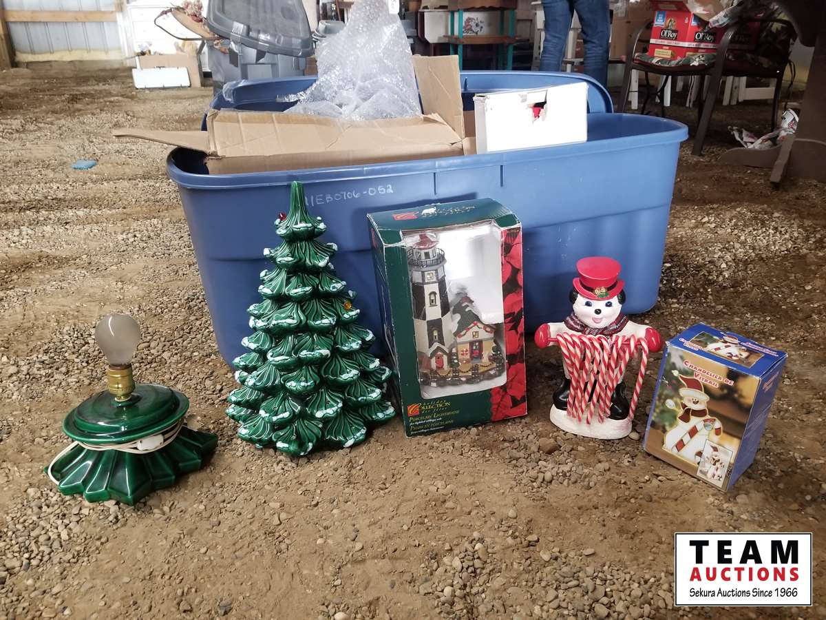 Extra Large Tote With Vintage Ceramic Christmas Tree, Porcelain Light House, Ceramic Snowman, Ceramic, Christmas Figurines, Misc