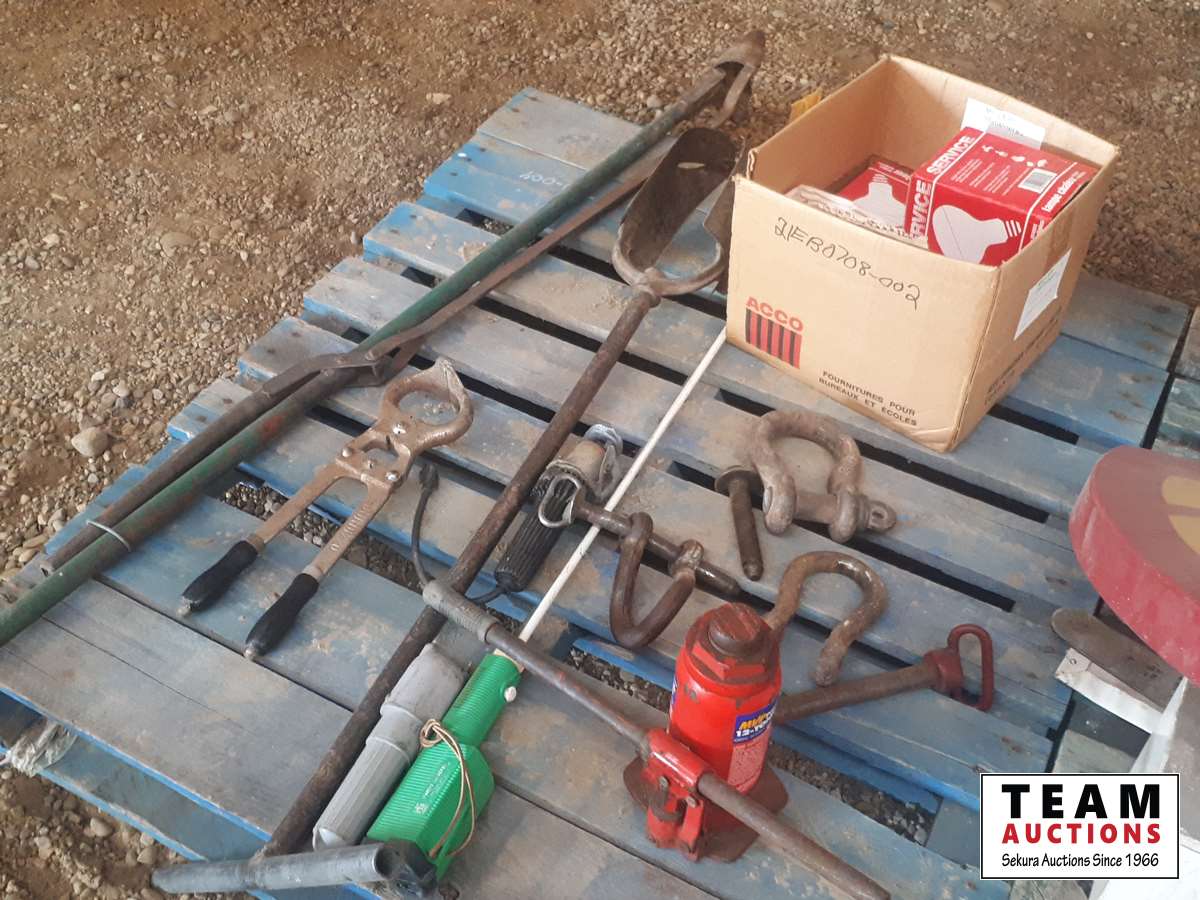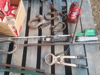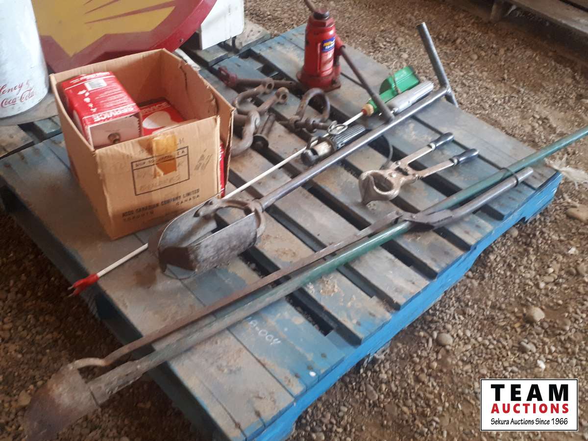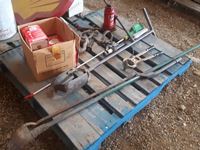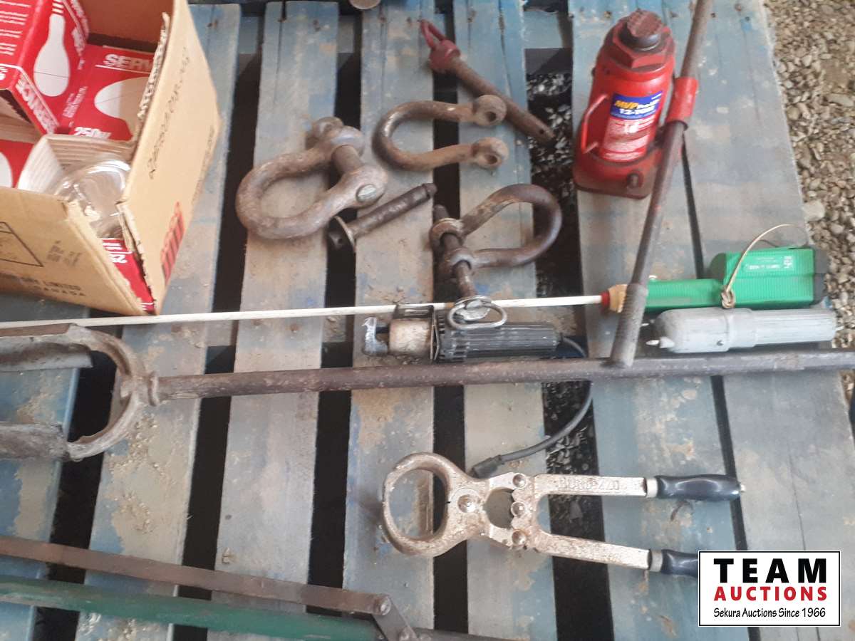 cattle prods, calf dehorner, post hole digger, dirt scoop, 12 ton jack, box with 5 heat lamps, clevises & pins