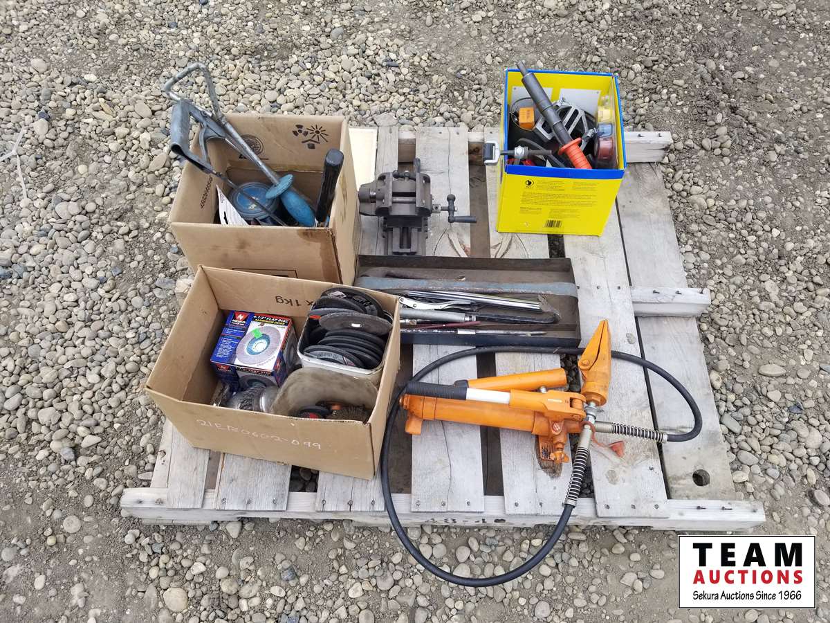 334 Pallet of Misc Shop Tools, Drill Bit, Small Shop Bench Vise, Grinder Blades & Misc Tools