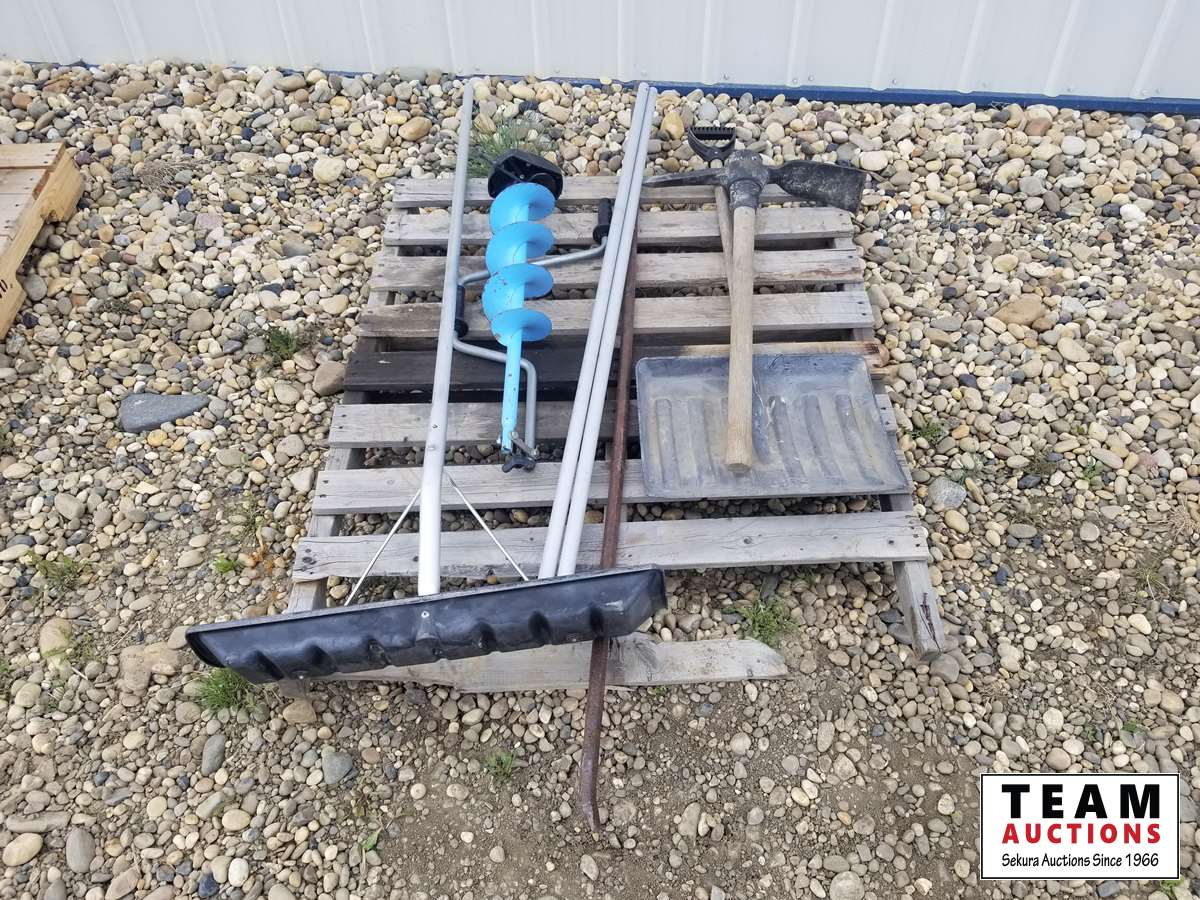 464 Pallet of Misc Shovels, Axe, Ice Auger & Misc