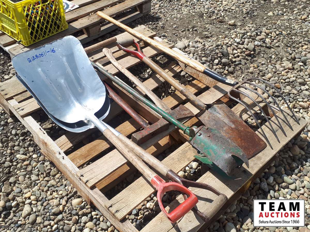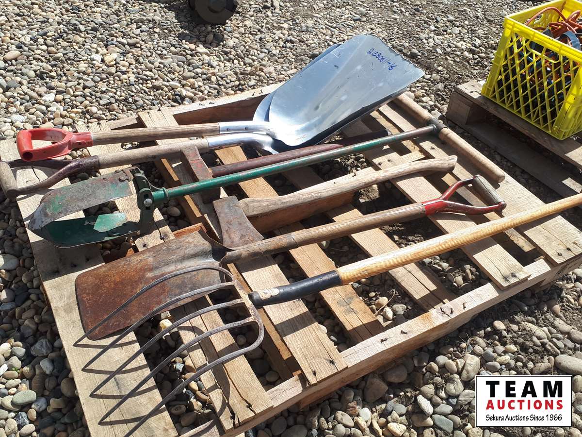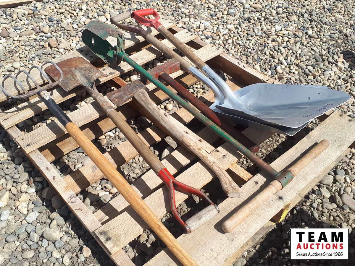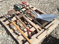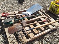 475 Pallet with Grain Shovels, Post Hole Digger, Ax, Hammer, Pitch Fork, Flat Shovel
