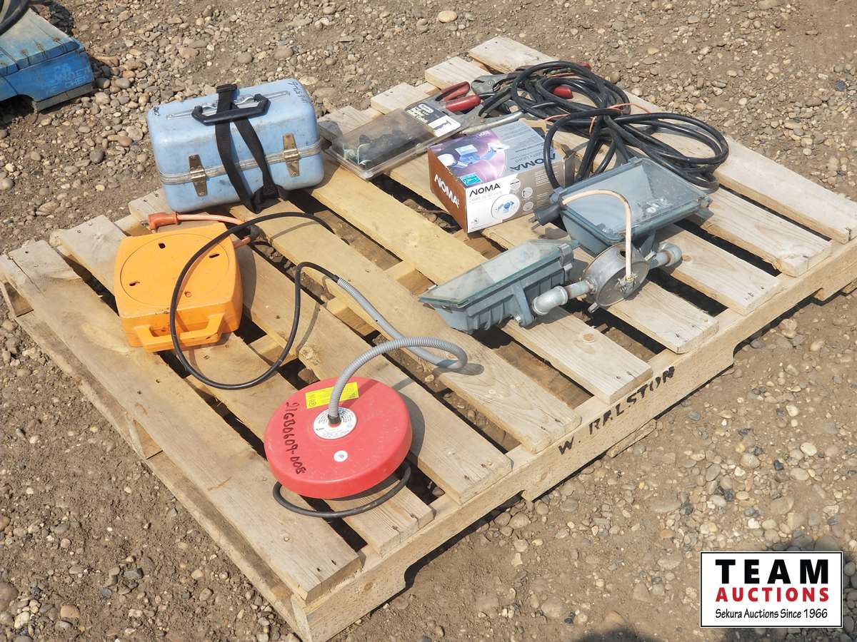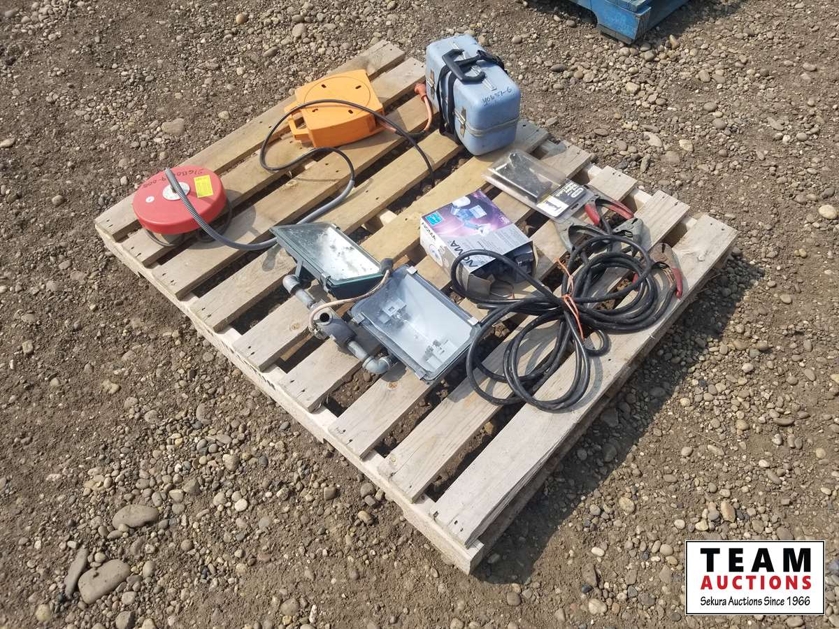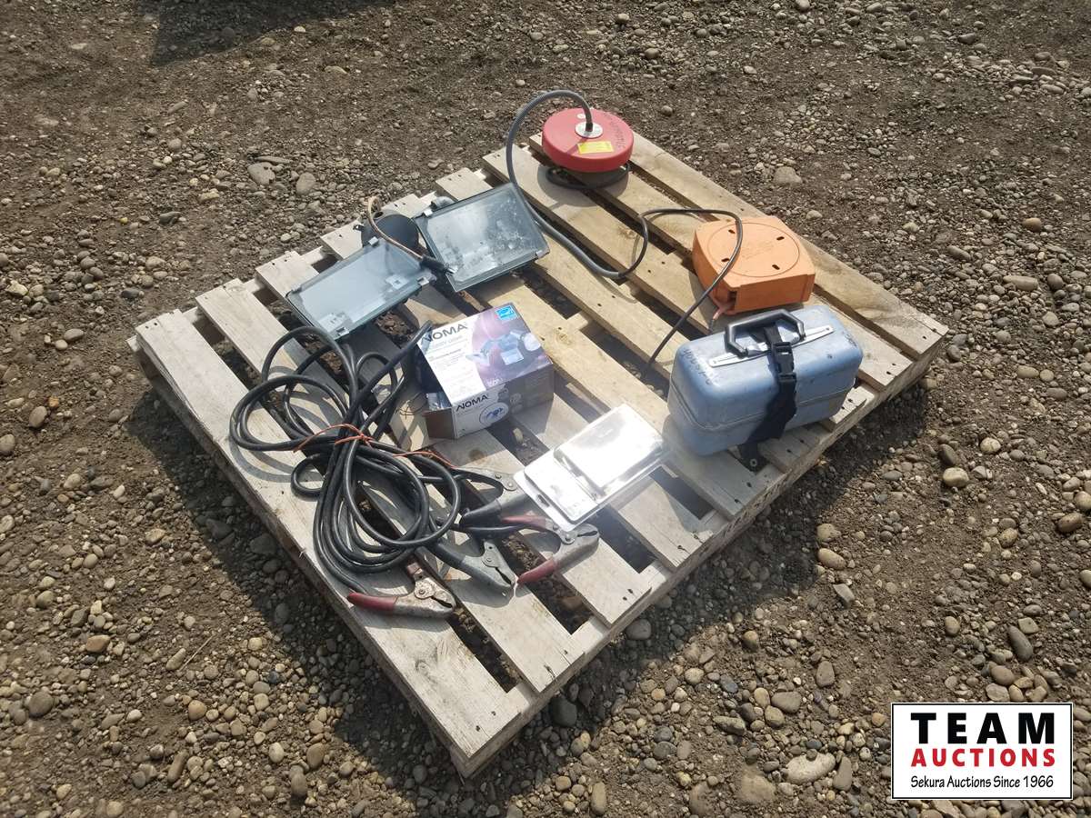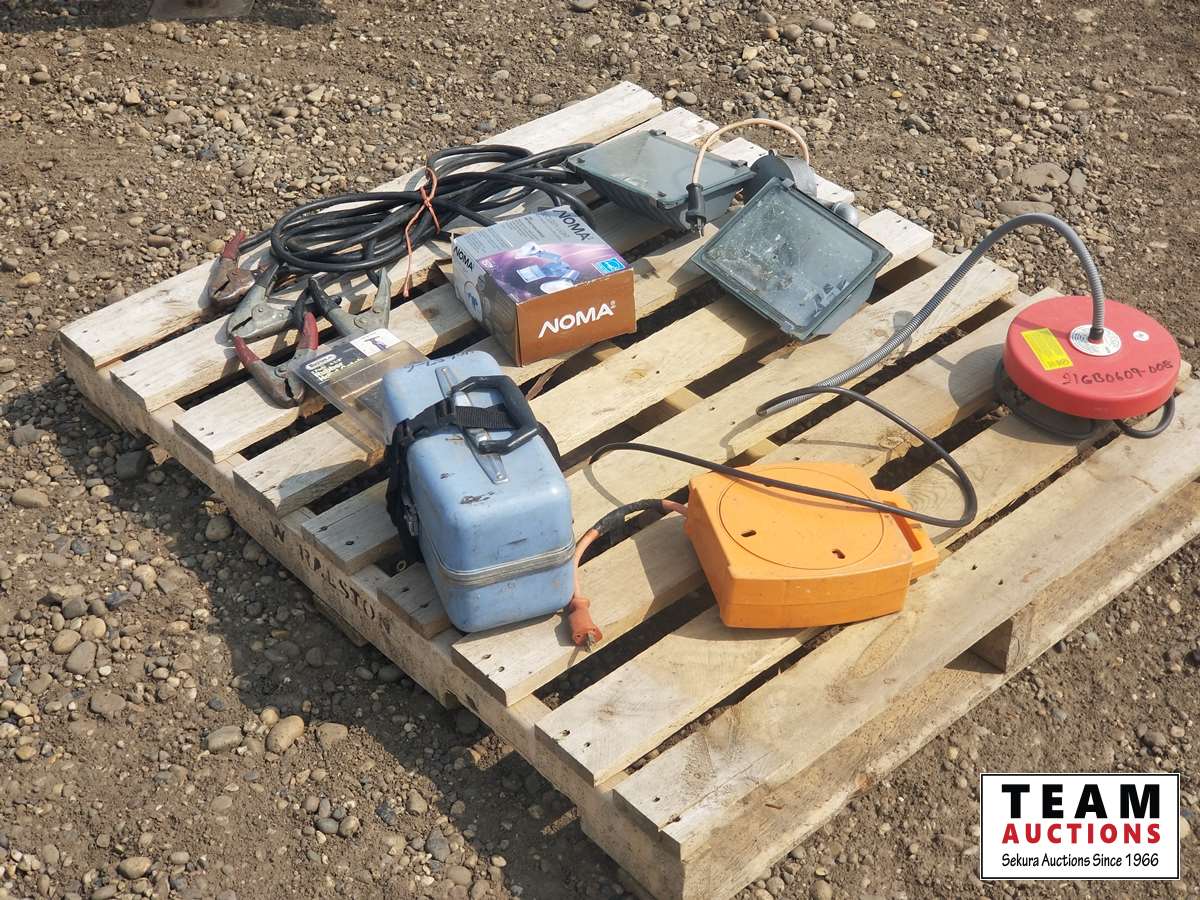 Double work light, booster cables, tank heater, rubber hood catch, 40657-6 dumpy level (eye piece loose) & miscellaneous