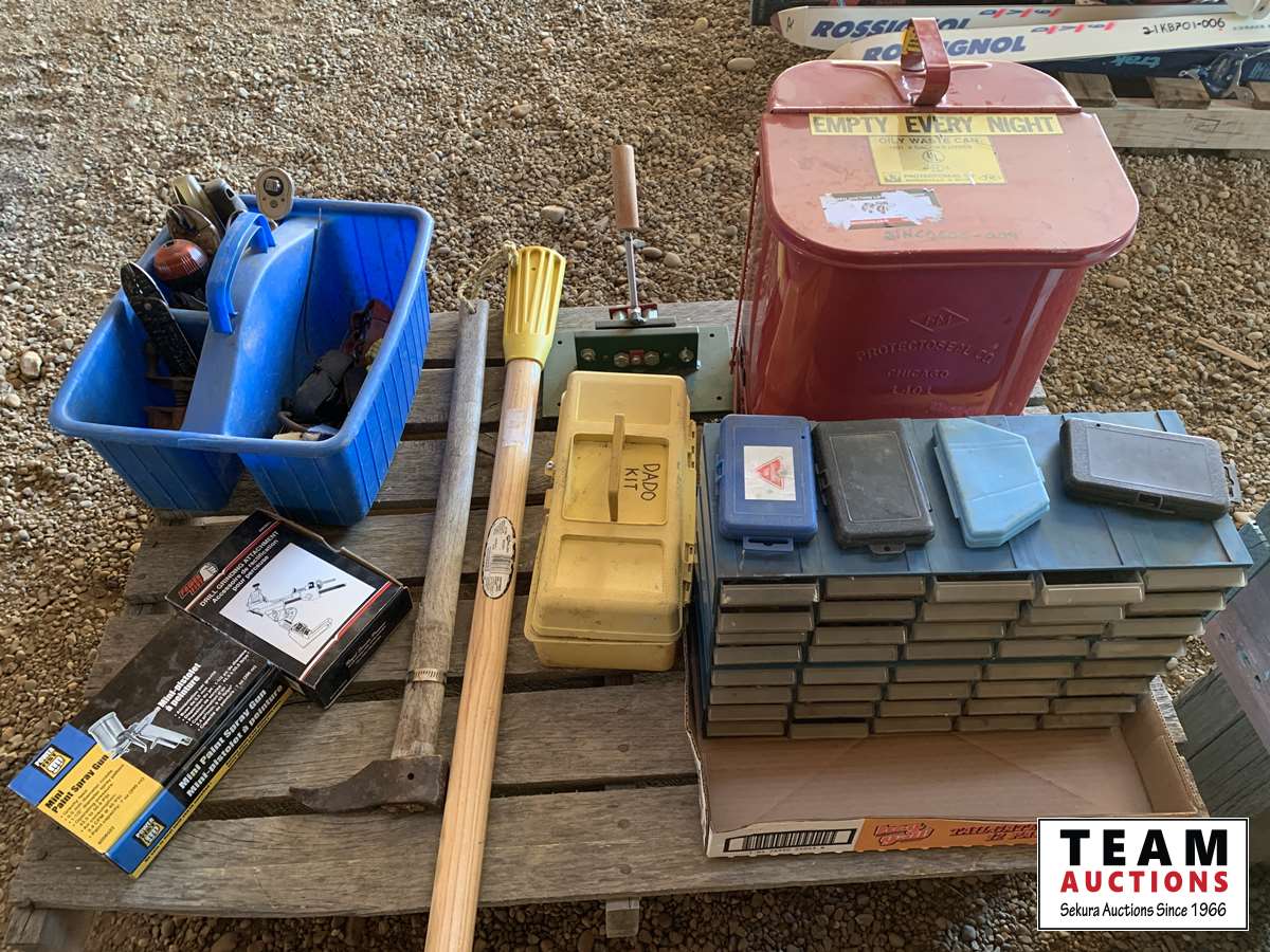 Waste oil container, drill bit sharpening attachment (as new), pick handle (unused), 30 drawer cabinet full assorted router bits & saw blades, dado kit, tool tote with miscellaneous tools, pick
