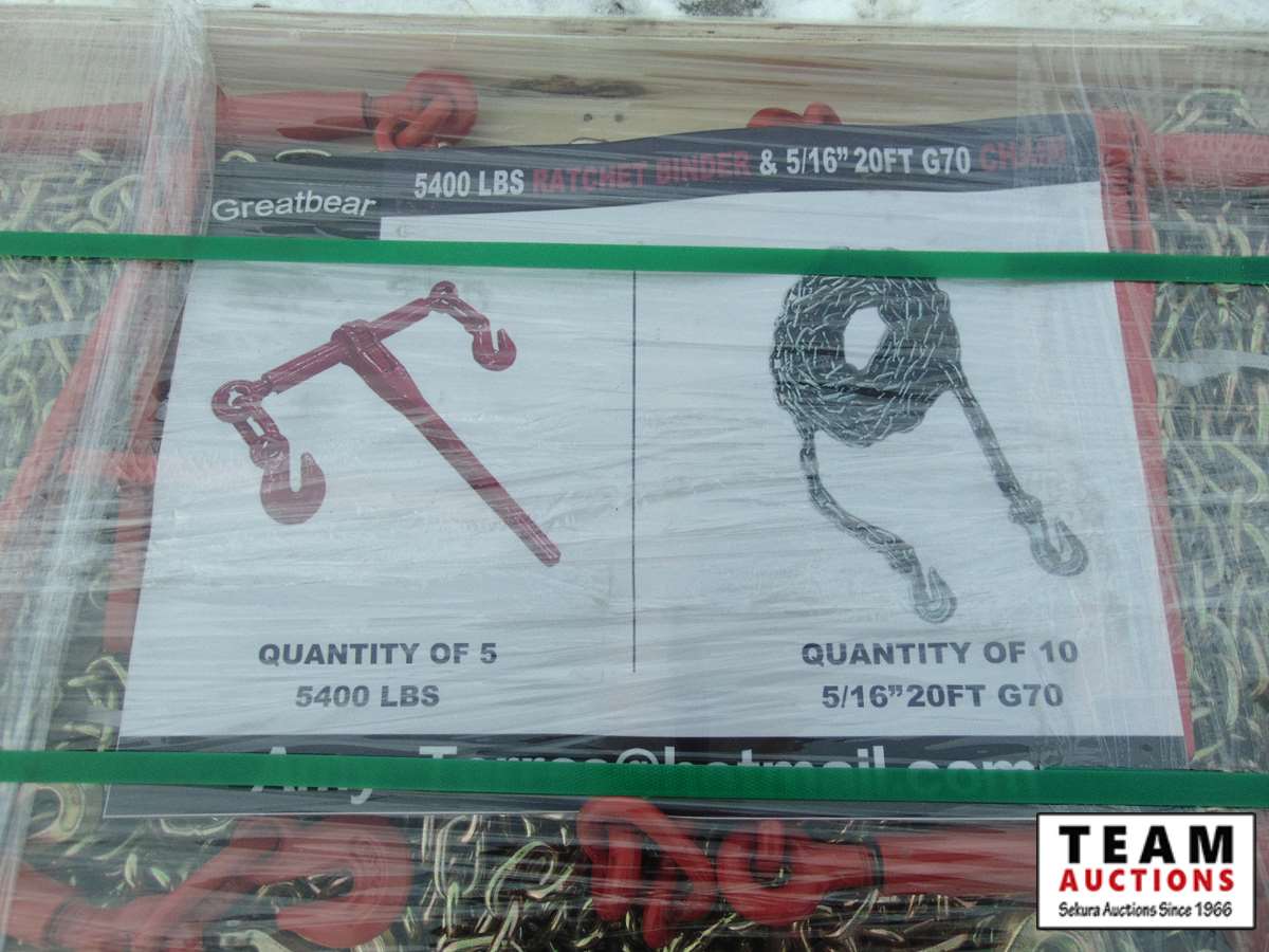 99 (5) 5400 LB Ratchet binder and Qty of (10) 5/16" 20FT G70 chain (Unused )