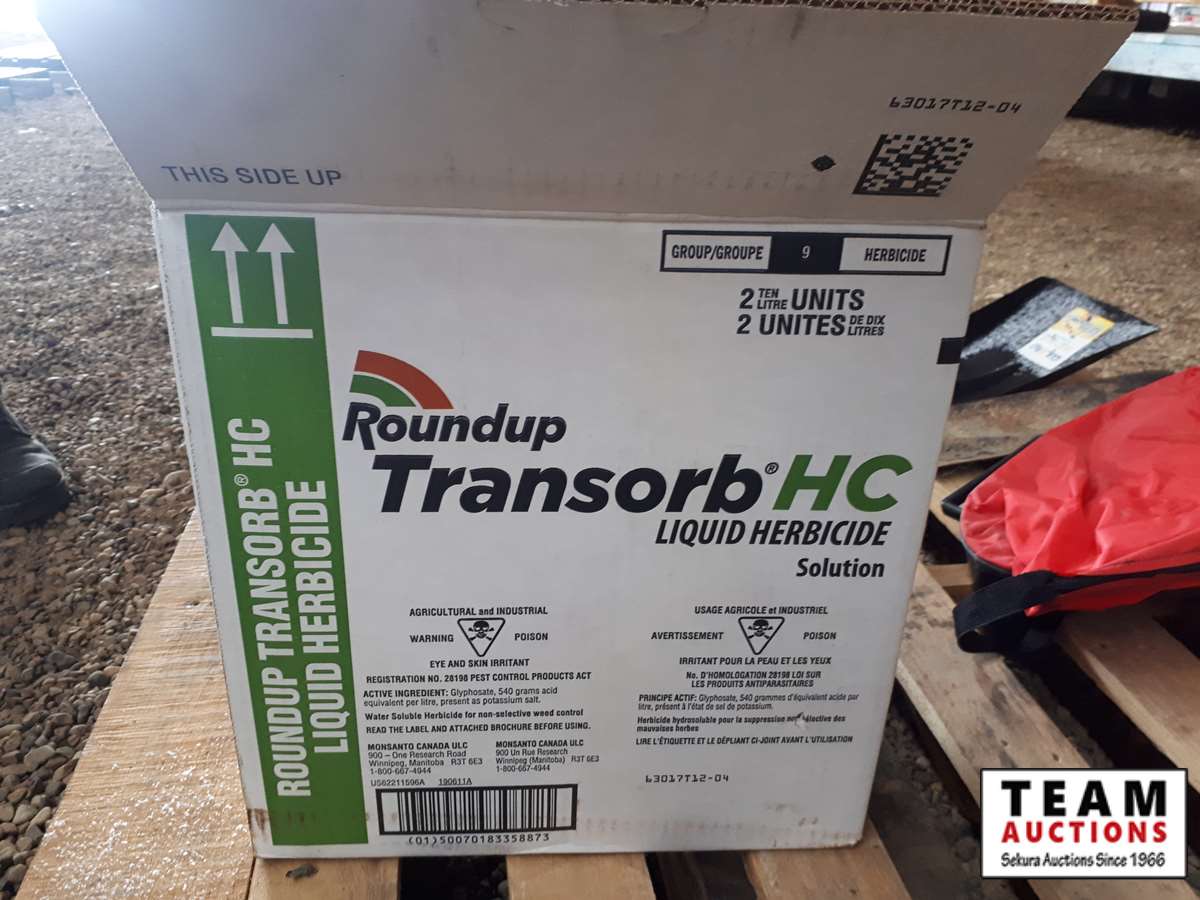 shovels, nylon bag, spreader/seeder, (2) full 10L jugs of Round Up