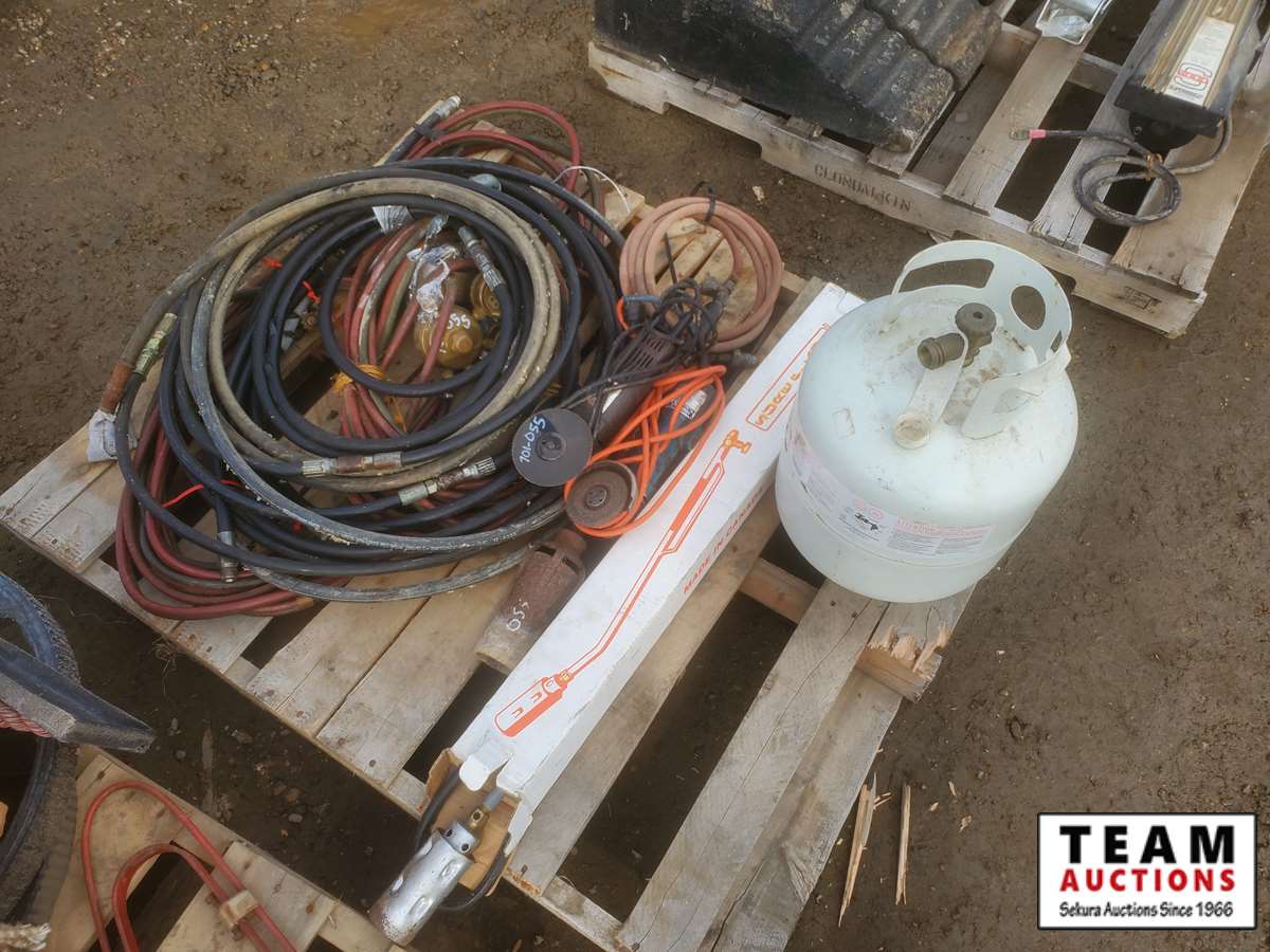 2 tiger torches, 100' of acetylene hose with gauges & torch, 2 grinders, propane bottles, misc hydraulic hose