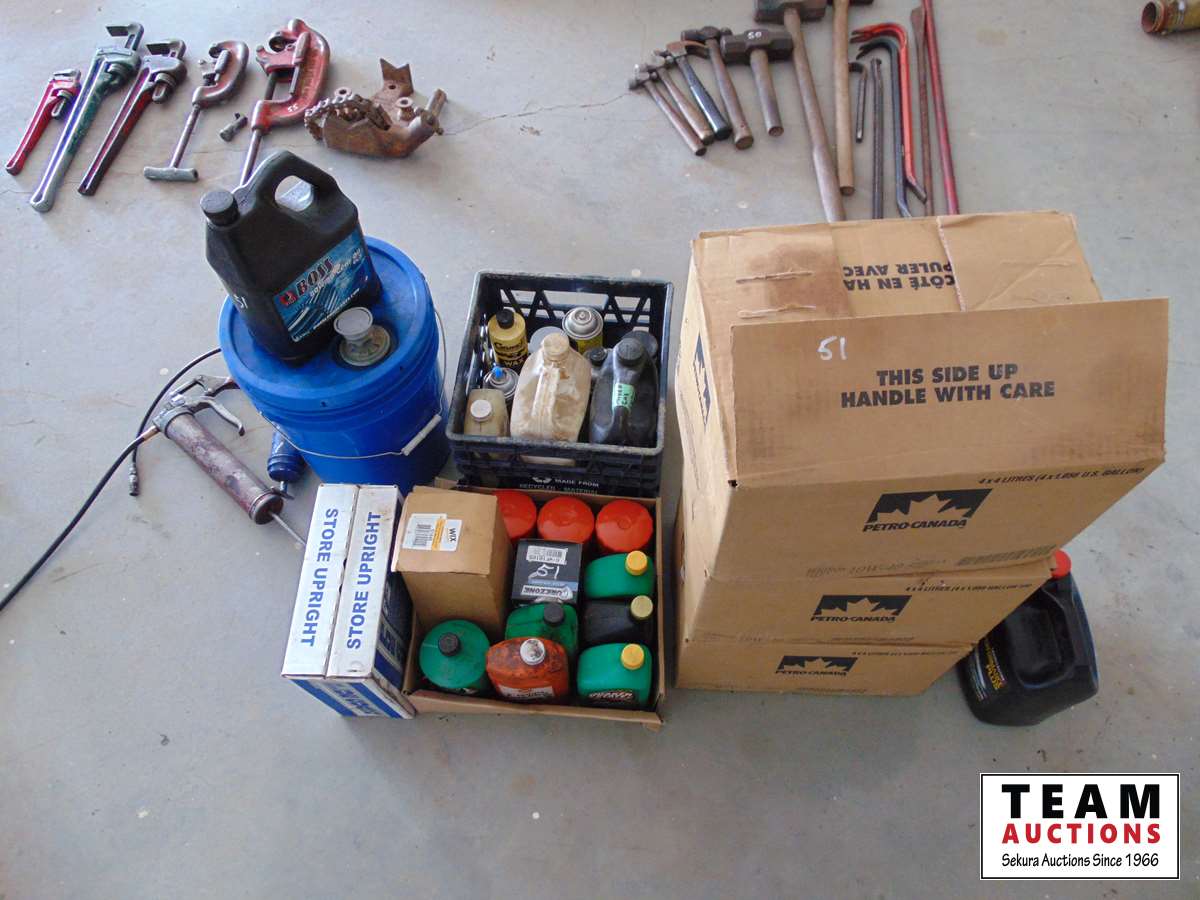 47 Assortment of Unused Oils & (2) Grease Guns