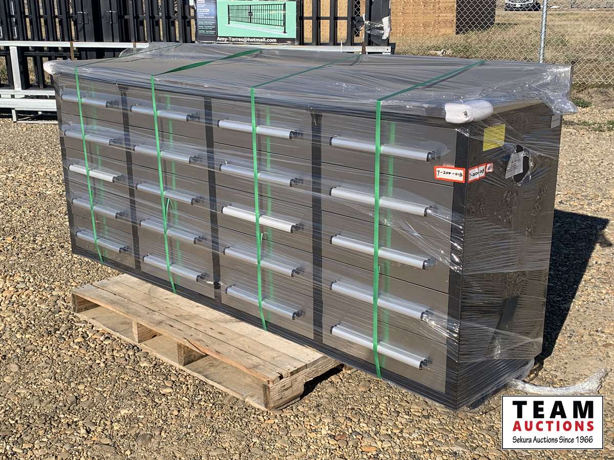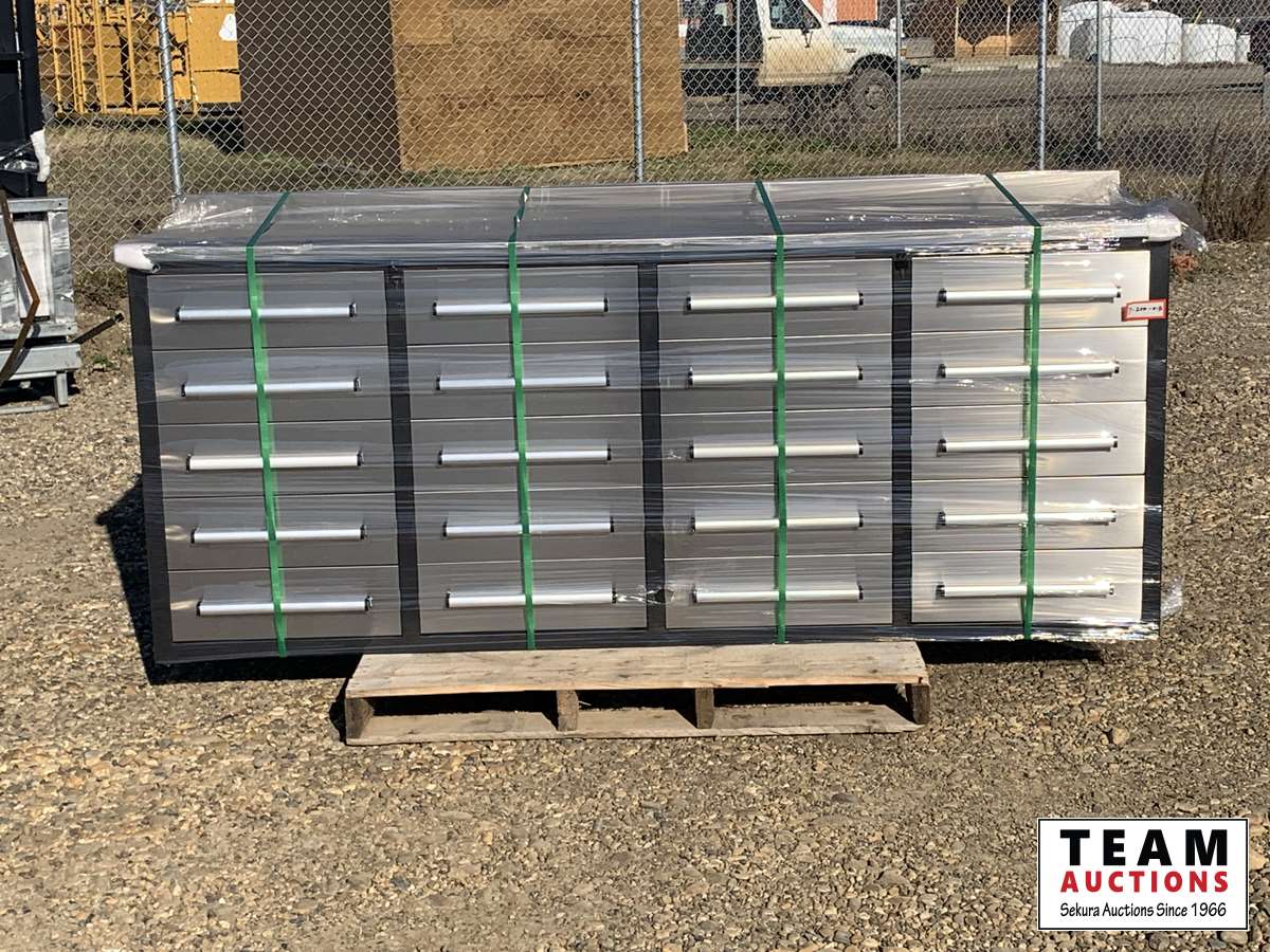 (10) drawers, (2) cabinets, 87 x 23 x 39 inch, drawers with lock and anti-slip liners, 3 rail sliding, stainless steel table top