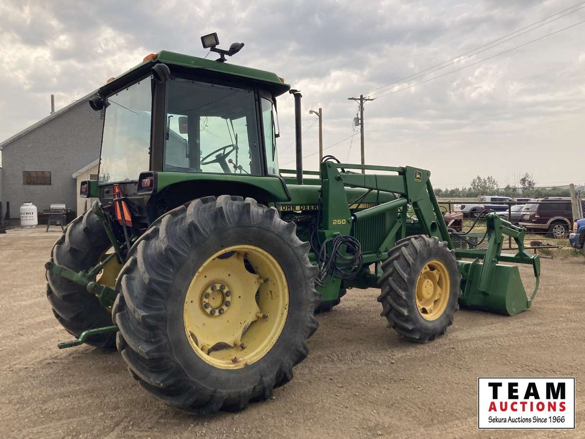 260 loader w/ grapple, A/C ca, John Deere TSS Creeper partially synchronized 12 speed, joystick, 2 hydraulic outlets, 540/1000 PTO, 3 pt hitch, 13.6R24 front, 520/70R34 rear