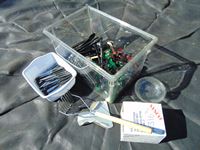 Kitchen utensils, large plastic container, large potato masher & miscellaneous