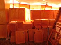 The kitchen cupboards have solid oak frame doors with oak plywood centers. The drawer fronts are solid oak. Additional glass doors that were on a China cabinet are included. The kitchen was approximately 14 ft by 15 ft plus two island sections. A counter top cooktop and double sink are included.
