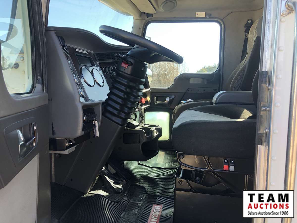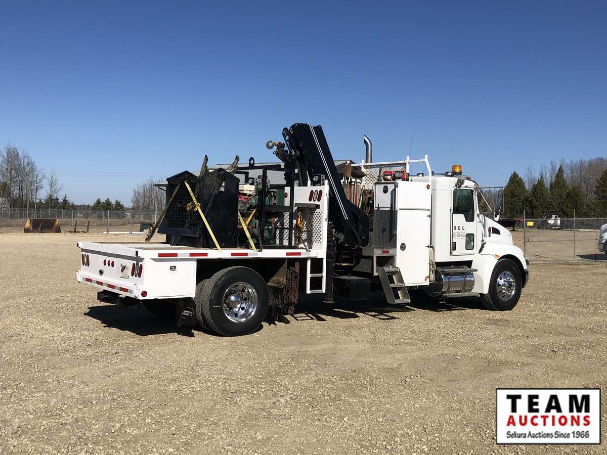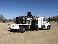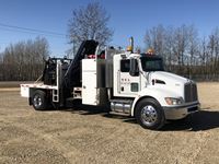 Paccar ISL9, 300 HP, exhaust brake, Allison 3500RDS A/T, Hendrickson A/R suspension, 14600 lb front, Dana S23190 23,000 lb rears, 248 in. WB, 5.57 ratio, 10 ft bed, 2012 Hiab 200-5, ctr mtd folding boom, dual ctrls, hydraulic outriggers, s/n 20004761, Central air compressor w/Honda GX340 engine, 2 ft x 4 ft man basket, 12R22.5F, 11R22.5R, AB CVIP 11/2021, 9,185 hrs, 255,683 kms