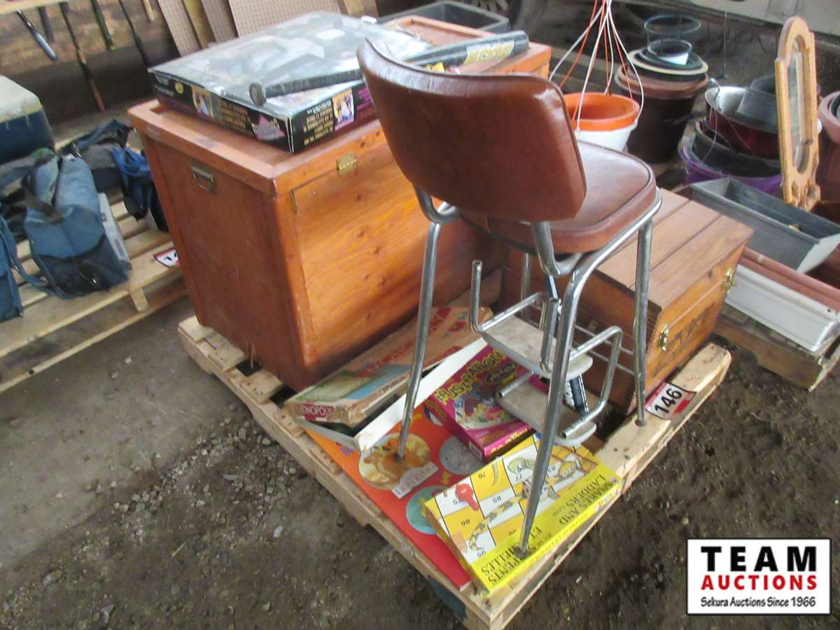 (2) chests, stool, board games, (2) baseball bats