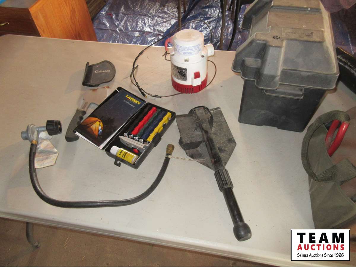 camping supplies, battery box, vacuum, hatchet, folding shovel, road side kit