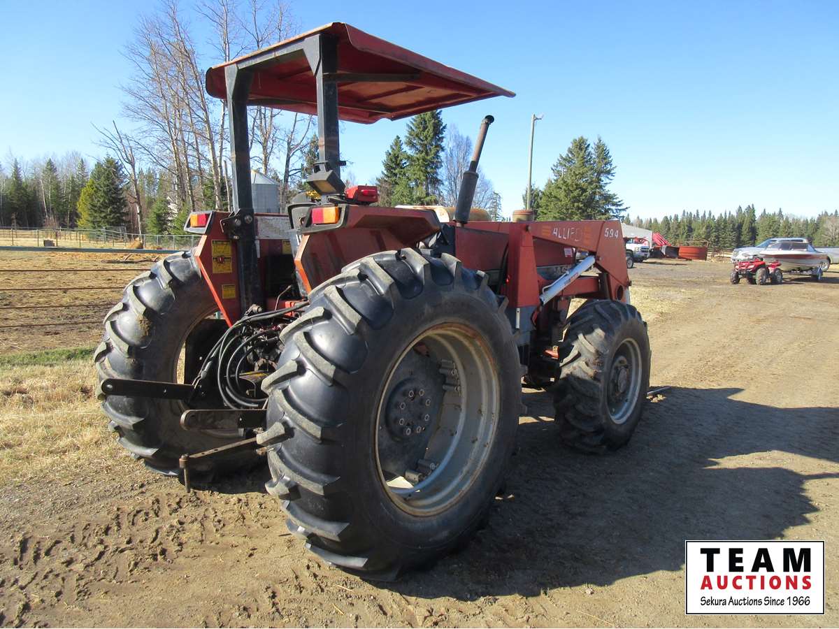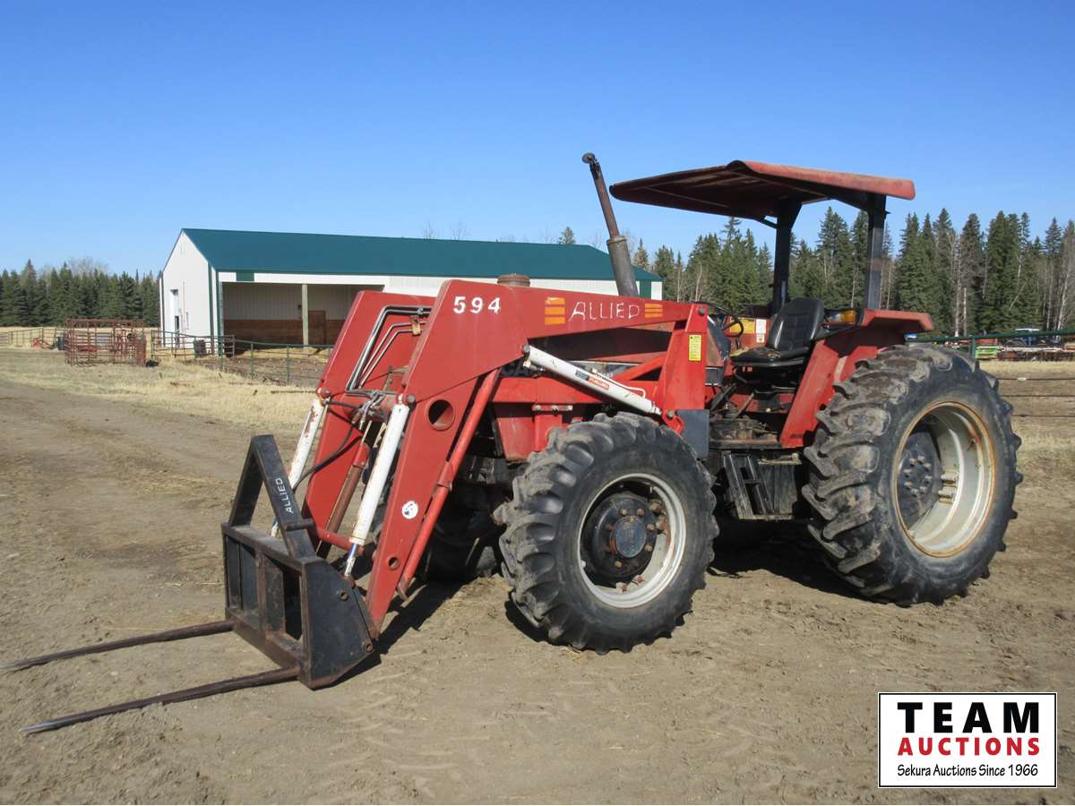 Allied loader, bale forks, 12 speed transmission, 3 Pt hitch, 540 PTO, (3) rear hydraulic outlets, roll bar with canopy, 13.6X24 front & 18.4X34 rear tires