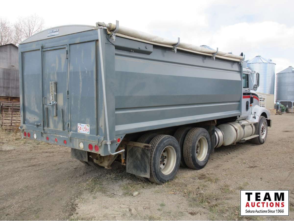 Cummins 400 engine, Eaton RTO 15618 Short Shift 18 speed transmission, rear air ride suspension, 385/65R22.5 frt & 295/75R22.5 rear tires, 18' steel box, silage endgate, box camera, Michael's roll tarp, 207" WB, 42,541 Kms showing