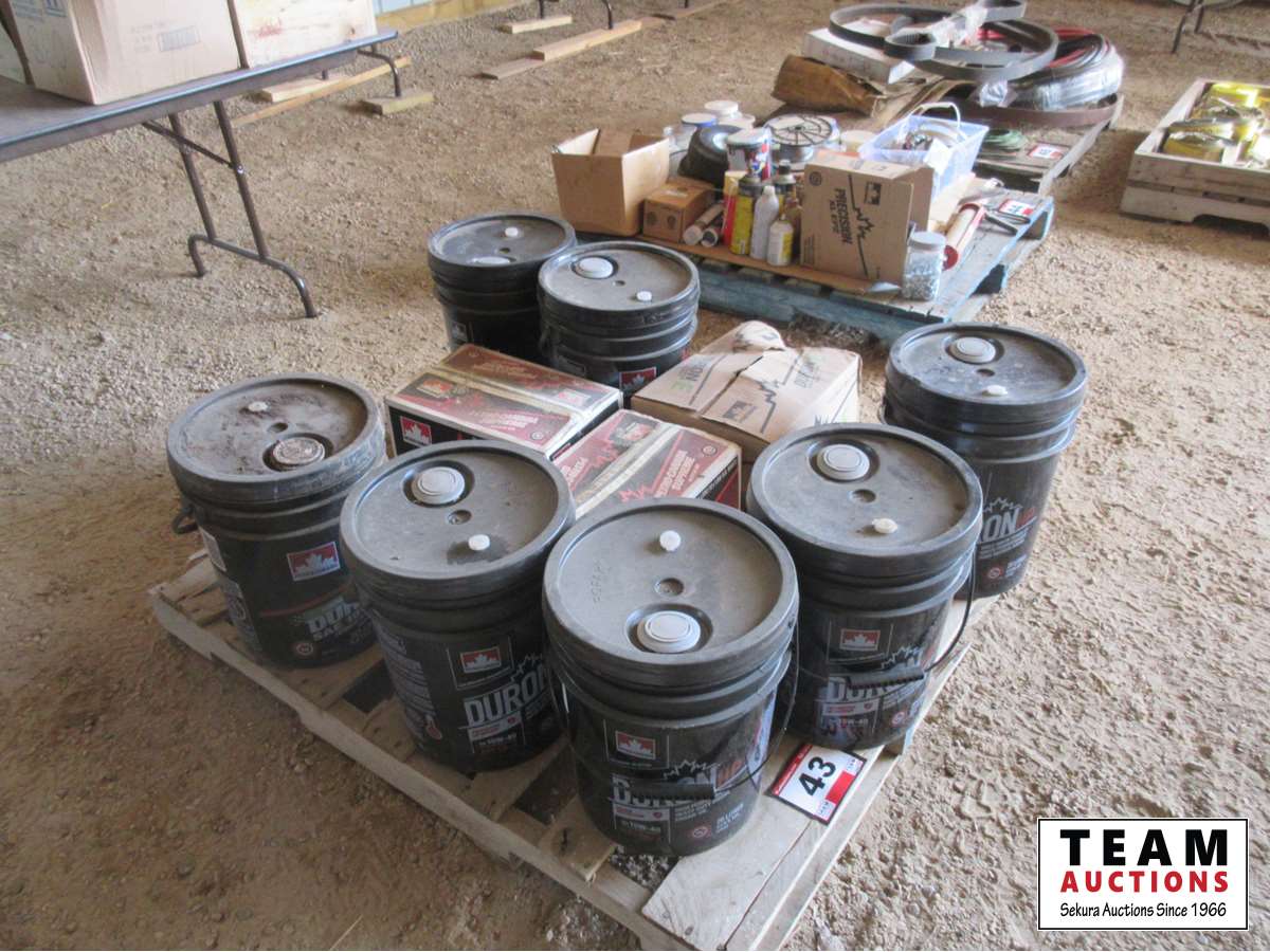 (6) pails of Duron HP 15W40 motor oil, (4) 4 litre jugs of 15W40 motor oil and ((24)1 litre 5W30 motor oil, (1) pail of Traxon 80W90 hypoid gear oil