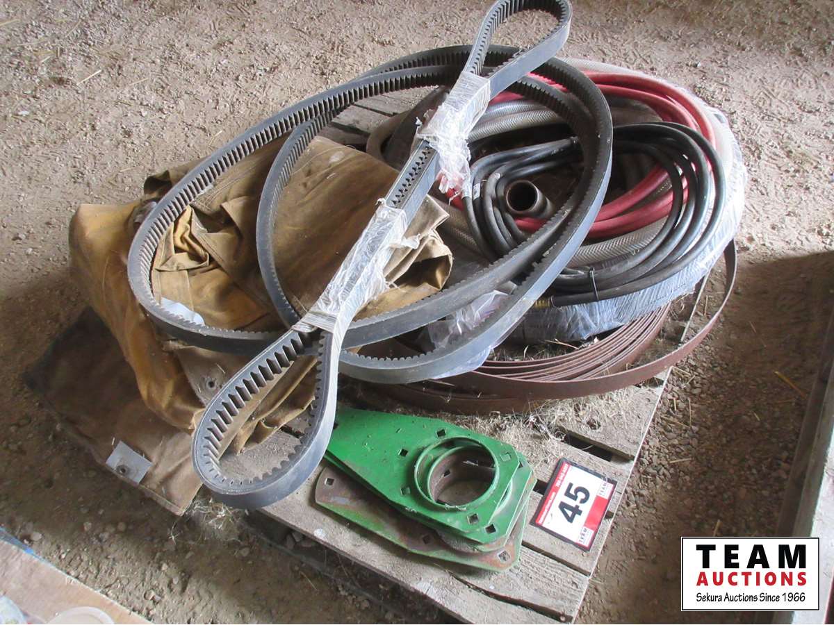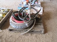 canvas tarp, air hoses, misc belts, 1" suction hose, reel of metal banding, propane hose