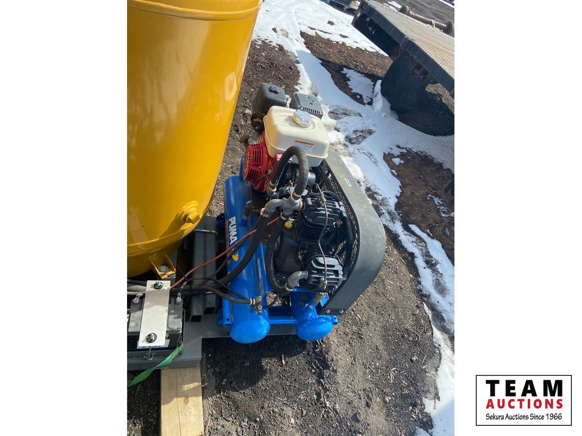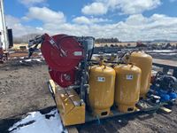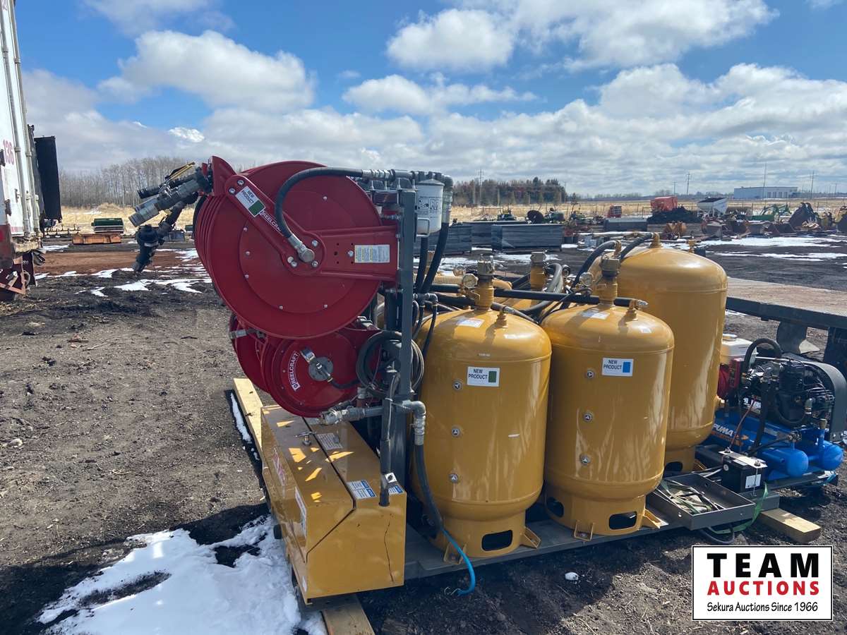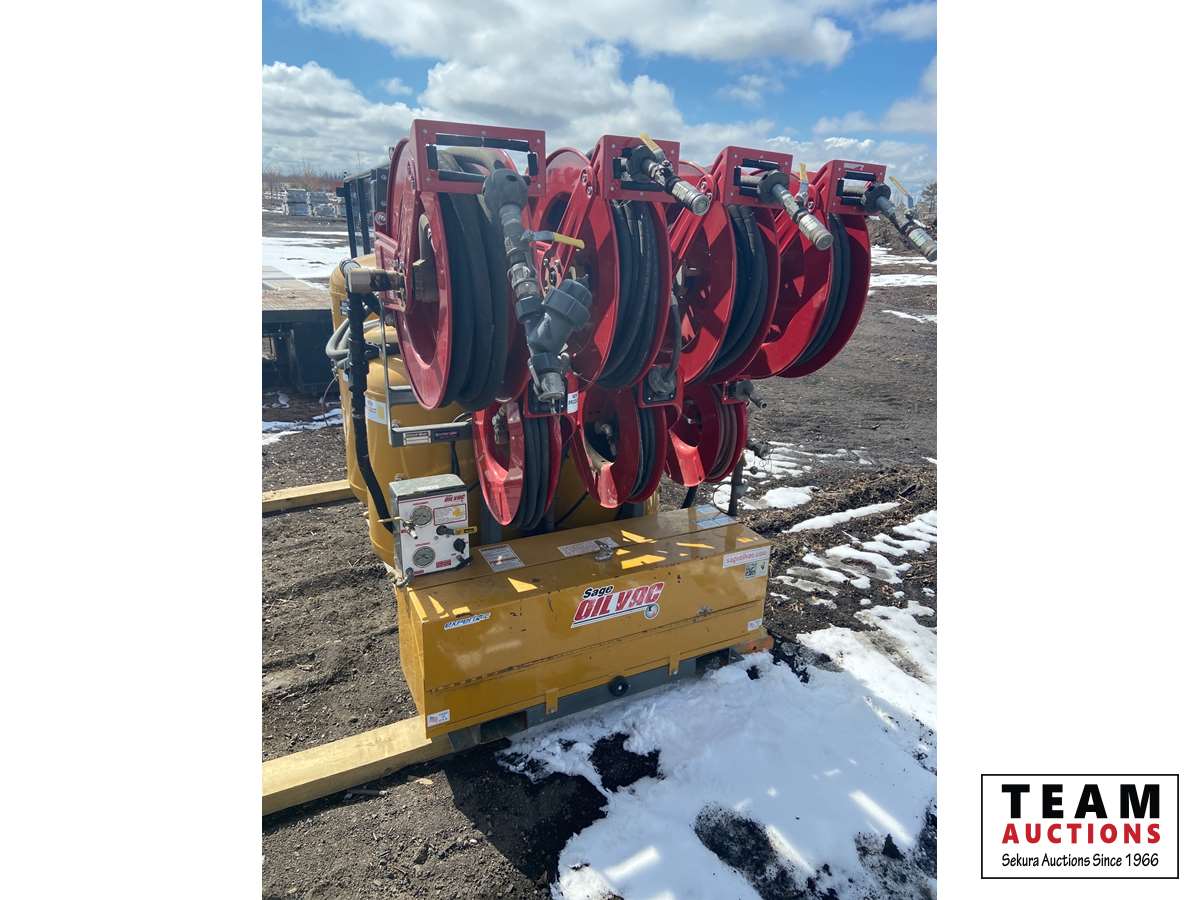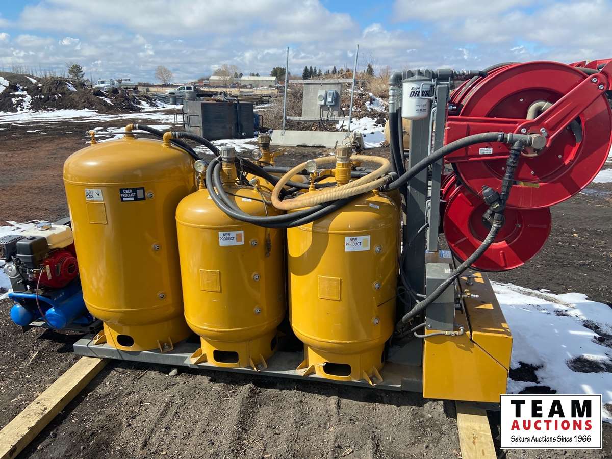 454 l used oil tank, 4 - 227 l new product tanks, 9 HP air compressor, all tanks and air on retractable reels, very little use