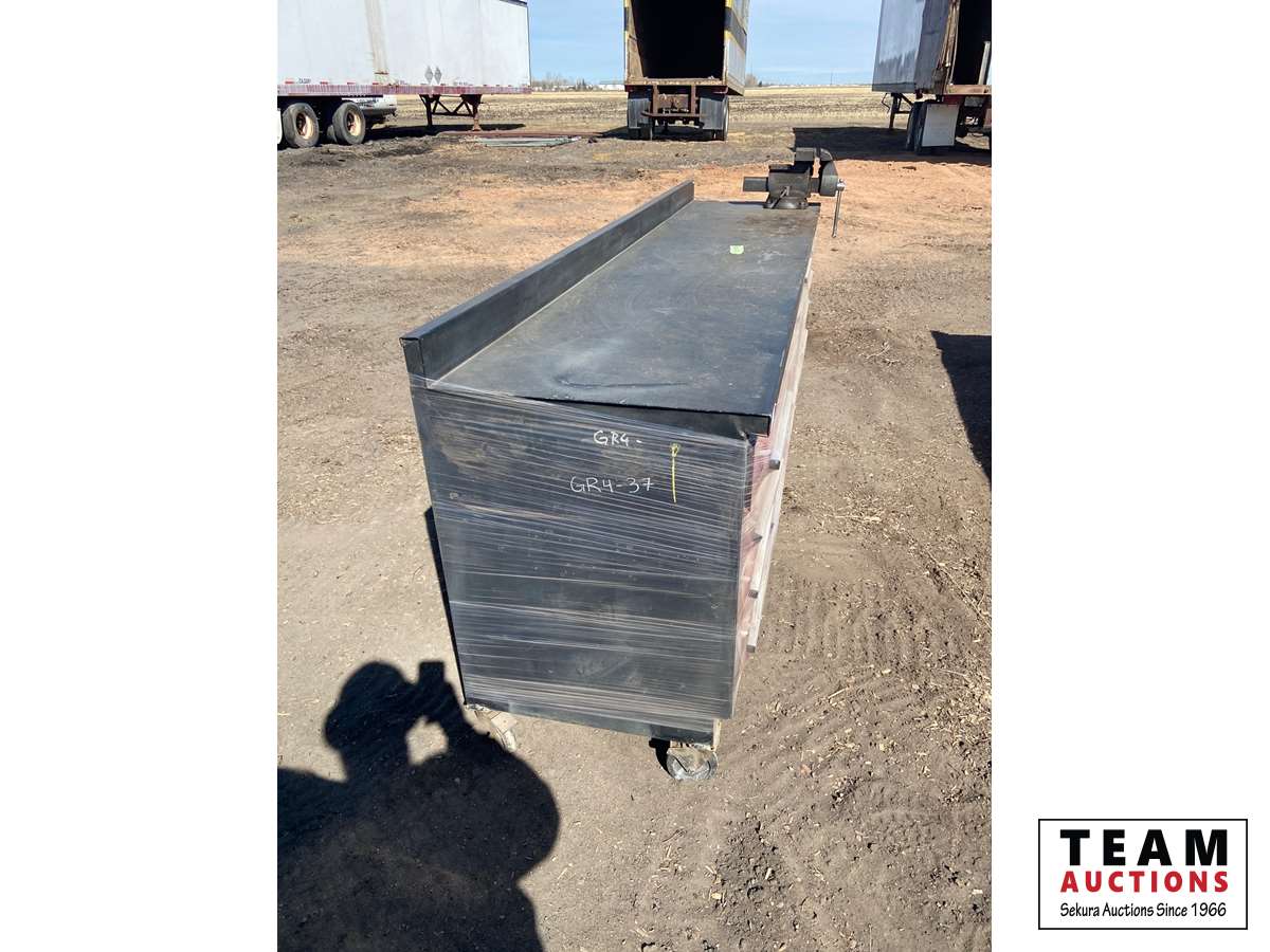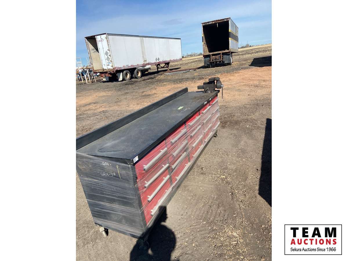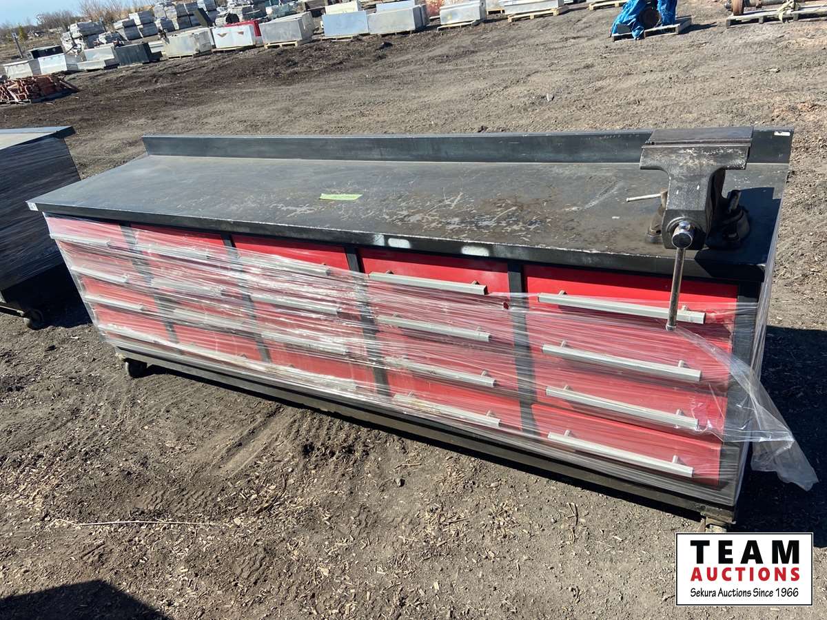 9'4" long 28"deep, 20 drawer, on wheels, comes with 8" vise